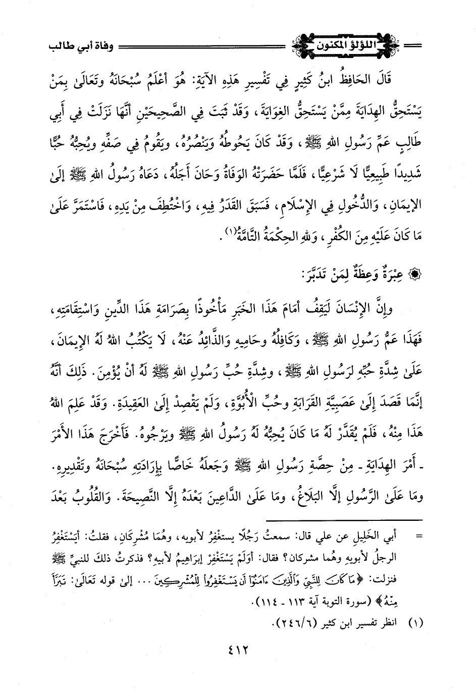 قَالَ الحَافِظُ ابنُ كَثِيرٍ في تَفْسِيرِ هَذِهِ الآيَةِ: هُوَ أعْلَمُ سُبْحَانَهُ وتَعَالَى بِمَنْ يَسْتَحِقُّ الهِدَايَةَ مِمَّنْ يَسْتَحِقُّ الغِوَايَةَ، وَقَدْ ثَبَتَ في الصَّحِيحَيْنِ أَنَّهَا نزلَتْ في أَبِي طَالِبٍ عَمِّ رَسُولِ اللَّهِ -صلى اللَّه عليه وسلم-، وَقَدْ كَانَ يَحُوطُهُ وَيَنْصُرُهُ، ويَقُومُ في صَفِّهِ ويُحِبُّهُ حُبًّا شَدِيدًا طَبِيعِيًّا لَا شَرْعِيًّا، فَلَمَّا حَضَرَتْهُ الوَفَاةُ وَحَانَ أَجَلُهُ، دَعَاهُ رَسُولُ اللَّهِ -صلى اللَّه عليه وسلم- إِلَى الإيمَانِ، وَالدُّخُولِ في الإِسْلَامِ، فَسَبَقَ القَدَرُ فِيهِ، وَاخْتُطِفَ مِنْ يَدِهِ، فَاسْتَمَرَّ عَلَى مَا كَانَ عَلَيْهِ مِنَ الكُفْرِ، وَللَّهِ الحِكْمَةُ التَّامَّةُ (¬1).