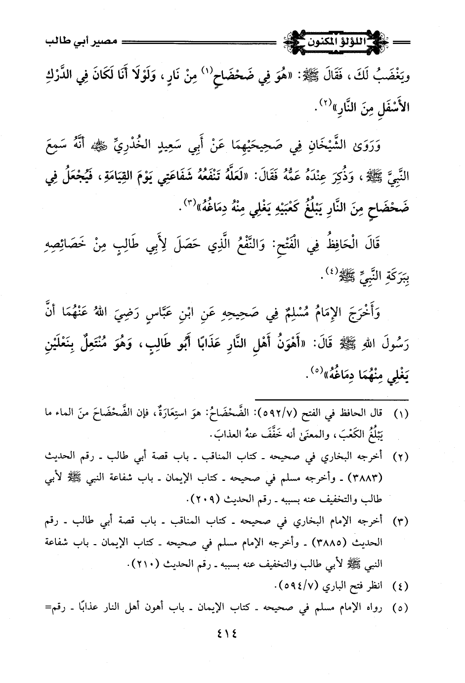 وأخْرَجَ الإِمَامُ مُسْلِمٌ في صَحِيحِهِ عَنِ ابْنِ عَبَّاسٍ رَضِيَ اللَّهُ عَنْهُمَا أَنَّ رَسُولَ اللَّهِ -صلى اللَّه عليه وسلم- قَالَ: "أَهْوَنُ أَهْلِ النَّارِ عَذَابًا أَبُو طَالِبٍ، وَهُوَ مُنْتَعِلٌ بِنَعْلَيْنِ يَغْلِي مِنْهُمَا دِمَاغُهُ" (¬4).