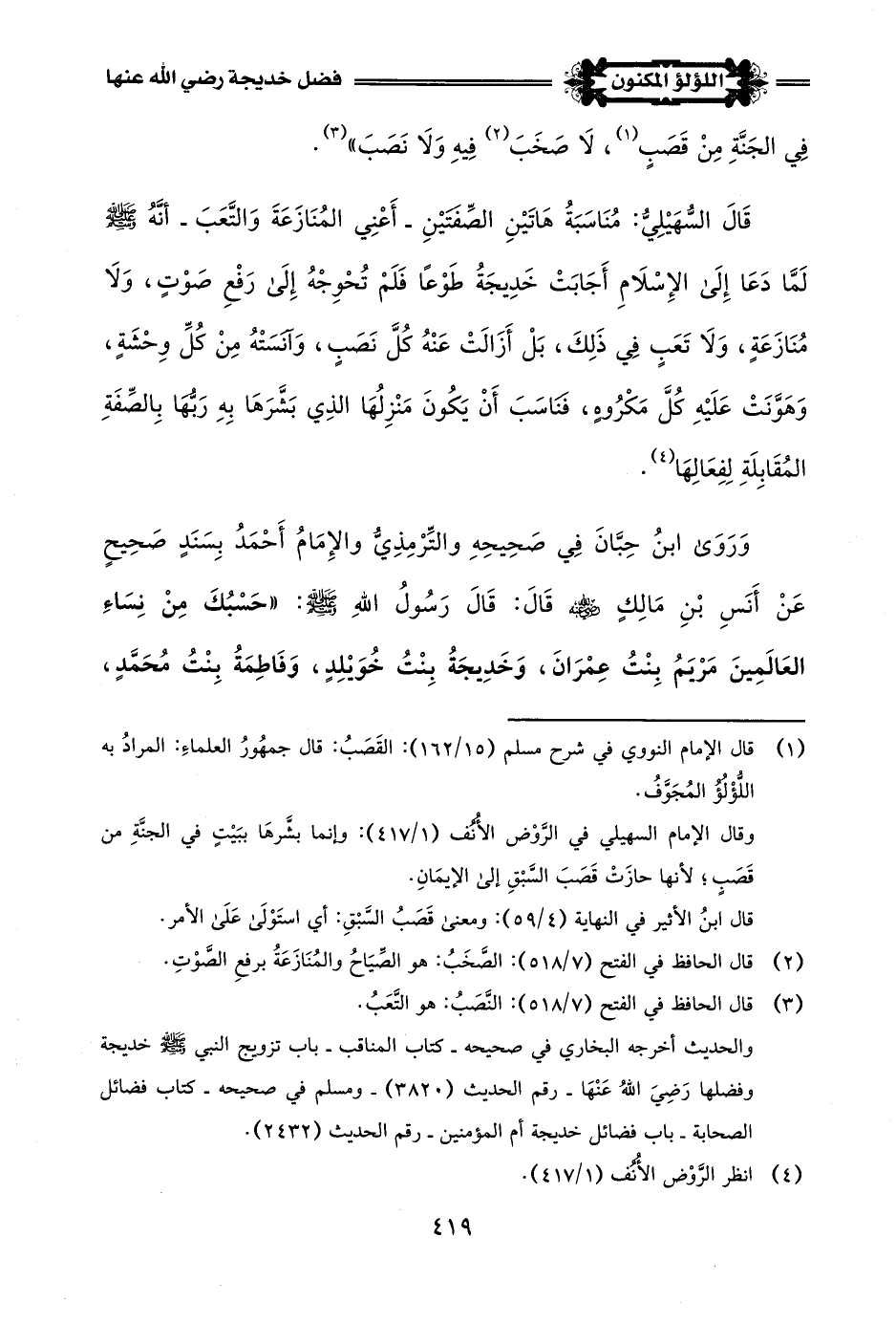 وقال الإمام السهيلي في الرَّوْض الأُنُف (1/ 417): وإنما بشَّرهَا ببَيْتٍ في الجنَّةِ من قَصَبٍ، لأنها حازَتْ قَصَبَ السَّبْقِ إلى الإيمَانِ.
