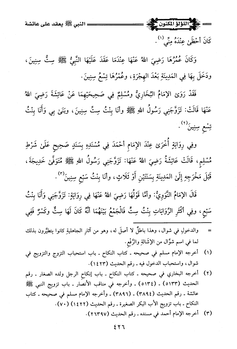 (¬2) أخرجه البخاري في صحيحه - كتاب النكاح - باب إنكاحِ الرجل ولده الصغار - رقم الحديث (5133) - (5134) - وأخرجه في مناقب الأنصار - باب تزويج النبي -صلى اللَّه عليه وسلم- عائشة - رقم الحديث (3894) - (3896) - وأخرجه الإمام مسلم في صحيحه - كتاب النكاح - باب تزويج الأب البكر الصغيرة - رقم الحديث (1422) (70).