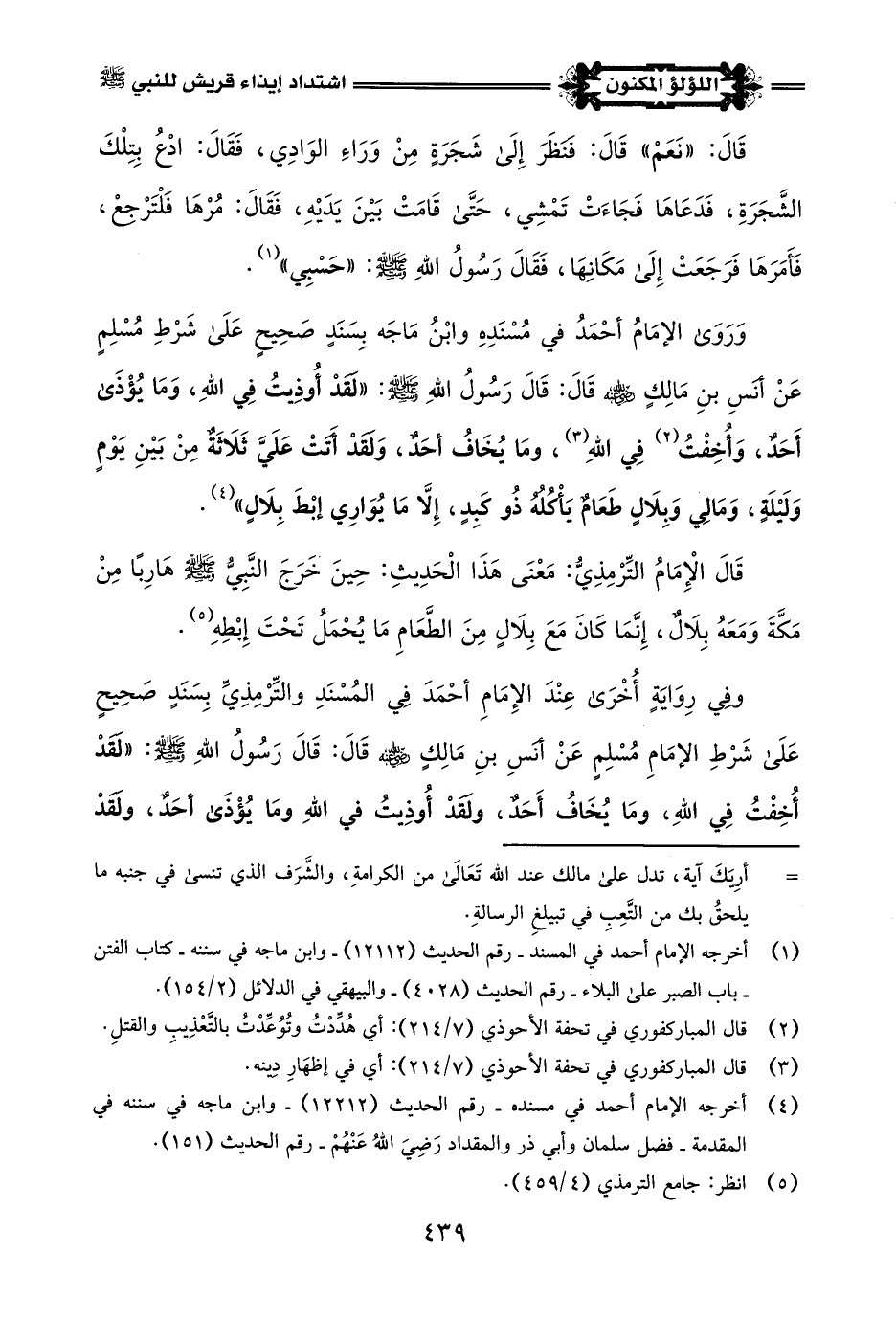وَرَوَى الإِمَامُ أَحْمَدُ في مُسْنَد وابْنُ مَاجَه بِسَنَدٍ صَحِيحٍ عَلَى شَرْطِ مُسْلِمٍ عَنْ أنَسِ بنِ مَالِكٍ -رضي اللَّه عنه- قَالَ: قَالَ رَسُولُ اللَّهِ -صلى اللَّه عليه وسلم-: "لقَدْ أُوذِيتُ في اللَّهِ، وَمَا يُؤْذَى أَحَدٌ، وَأُخِفْتُ (¬2) في اللَّهِ (¬3)، ومَا يُخَافُ أَحَدٌ، وَلقَدْ أتَتْ عَلَيَّ ثَلَاثَةٌ مِنْ بَيْنِ يَوْمٍ وَلَيْلَةٍ، وَمَالِي وَبِلَالٍ طَعَامٌ يَأْكُلُهُ ذُو كَبِدٍ، إِلَّا مَا يُوَارِي إبْطَ بِلَالٍ" (¬4).