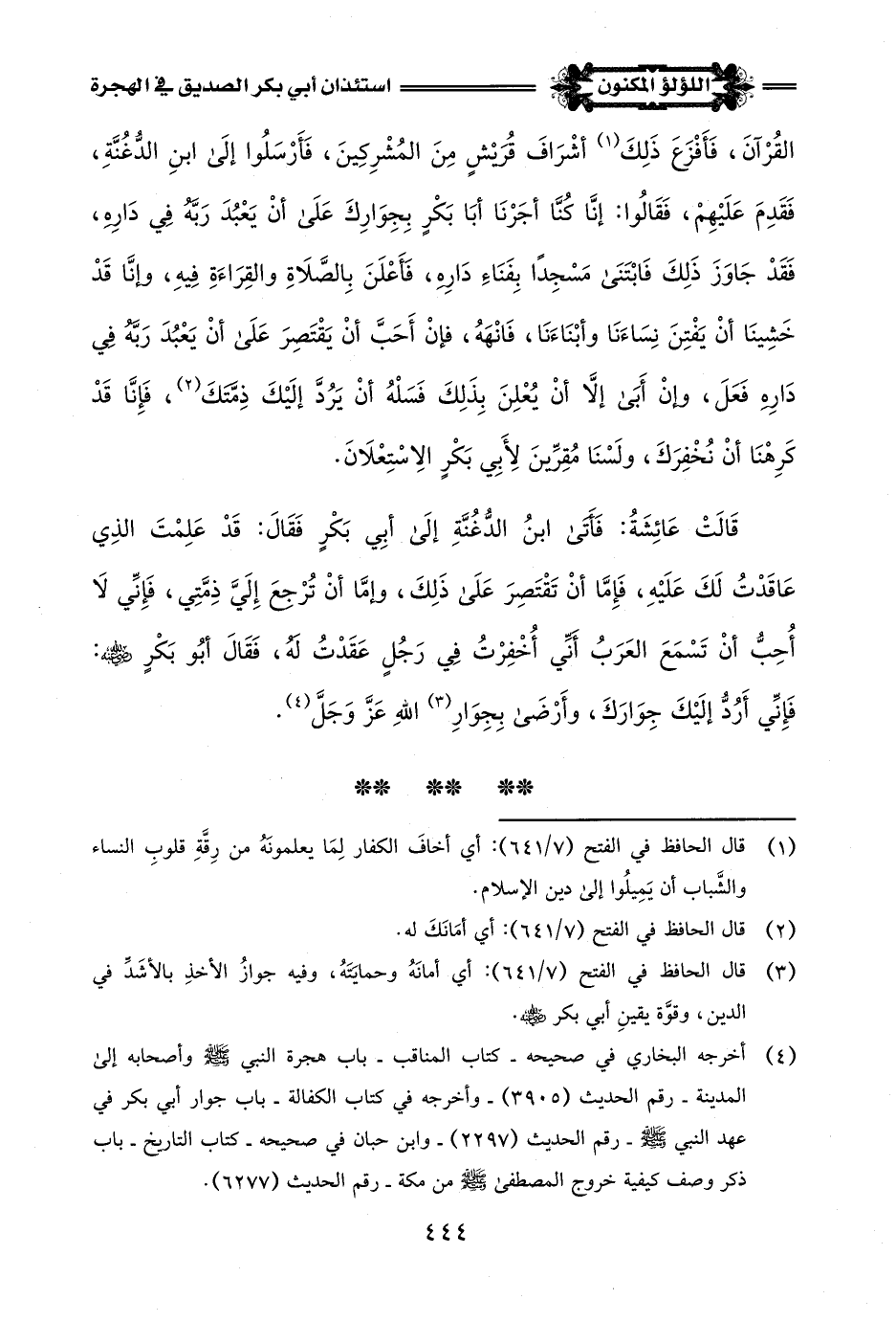 (¬4) أخرجه البخاري في صحيحه - كتاب المناقب - باب هجرة النبي -صلى اللَّه عليه وسلم- وأصحابه إلى المدينة - رقم الحديث (3905) - وأخرجه في كتاب الكفالة - باب جوار أبي بكر في عهد النبي -صلى اللَّه عليه وسلم- رقم الحديث (2297) - وابن حبان في صحيحه - كتاب التاريخ - باب ذكر وصف كيفية خروج المصطفى -صلى اللَّه عليه وسلم- من مكة