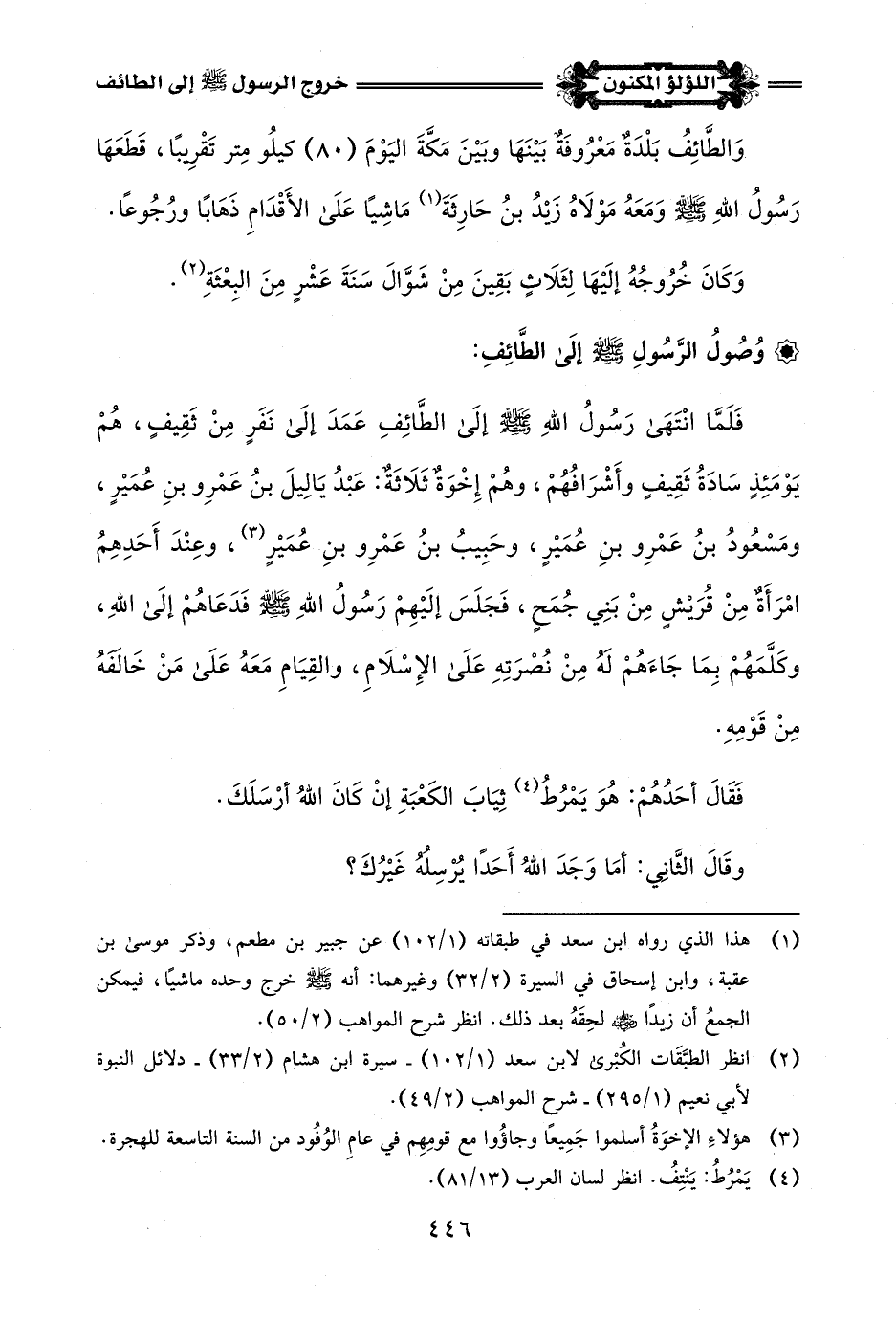 (¬1) هذا الذي رواه ابن سعد في طبقاته (1/ 102) عن جبير بن مطعم، وذكر موسى بن عقبة، وابن إسحاق في السيرة (2/ 32) وغيرهما: أنَّه -صلى اللَّه عليه وسلم- خرج وحده ماشيًا، فيمكن الجمعُ أن زيدًا -رضي اللَّه عنه- لحِقَهُ بعد ذلك. انظر شرح المواهب (2/ 50).