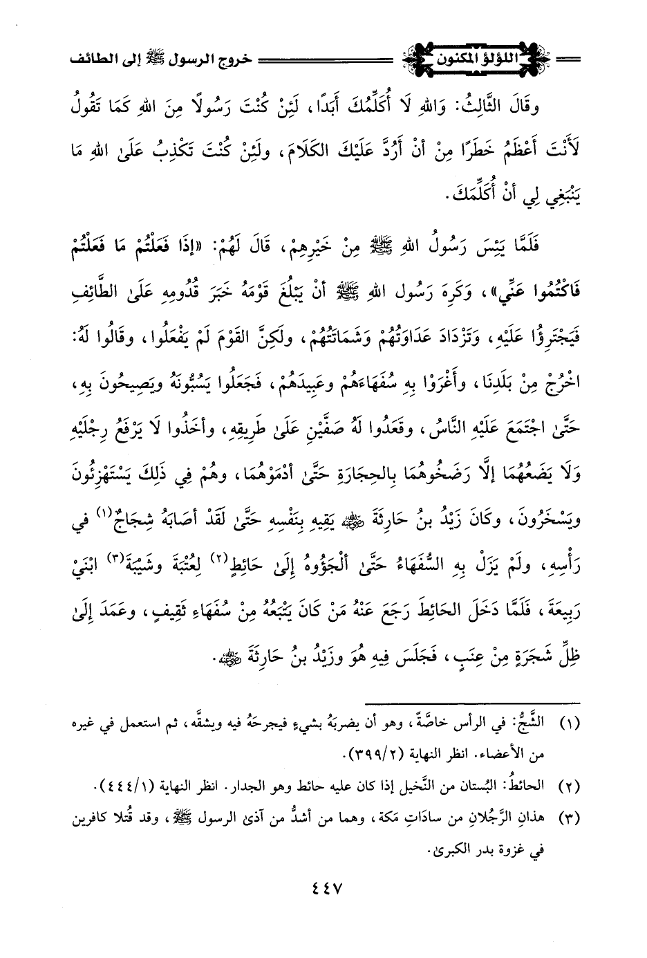 فَلَمَّا يَئِسَ رَسُولُ اللَّهِ -صلى اللَّه عليه وسلم- منْ خَيْرِهِمْ، قَالَ لَهُمْ: "إِذَا فَعَلْتُمْ مَا فَعَلْتُمْ فَاكْتُمُوا عَنِّي"، وَكَرِهَ رَسُول اللَّهِ -صلى اللَّه عليه وسلم- أَنْ يَبْلُغَ قَوْمَهُ خَبَرَ قُدُومِهِ عَلَى الطَّائِفِ فَيَجْتَرِؤُا عَلَيْهِ، وَتَزْدَادَ عَدَاوَتُهُمْ وَشَمَاتَتُهُمْ، ولَكِنَّ القَوْمَ لَمْ يَفْعَلُوا، وقَالُوا لَهُ: اخْرُجْ مِنْ بَلَدِنَا، وأَغْرَوْا بِهِ سُفَهَاءَهُمْ وعَبِيدَهُمْ، فَجَعَلُوا يَسُبُّونَهُ ويَصِيحُونَ بِهِ، حَتَّى اجْتَمَعَ عَلَيْهِ النَّاسُ، وقَعَدُوا لَهُ صَفَّيْنِ عَلَى طَرِيقِهِ، وأخَذُوا لَا يَرْفَعُ رِجْلَيْهِ وَلَا يَضَعُهُمَا إِلَّا رَضَخُوهُمَا بِالحِجَارَةِ حَتَّى أدْمَوْهُمَا، وهُمْ في ذَلِكَ يَسْتَهْزِئُونَ ويَسْخَرُونَ، وكَانَ زَيْدُ بنُ حَارِثَةَ -رضي اللَّه عنه- يَقِيهِ بِنَفْسِهِ حَتَّى لَقَدْ أصَابَهُ شِجَاجٌ (¬1) في رَأْسِهِ، وَلَمْ يَزَلْ بِهِ السُّفَهَاءُ حَتَّى ألْجَؤُوهُ إِلَى حَائِطٍ (¬2) لِعُتْبَةَ وشَيْبَةَ (¬3) ابْنَيْ رَبِيعَةَ، فَلَمَّا دَخَلَ الحَائِطَ رَجَعَ عَنْهُ مَنْ كَانَ يَتْبَعُهُ مِنْ سُفَهَاءَ ثَقِيفٍ، وعَمَدَ إِلَى ظِلِّ شَجَرَةٍ مِنْ عِنَبٍ، فَجَلَسَ فِيهِ هُوَ وزَيْدُ بنُ حَارِثَةَ -رضي اللَّه عنه-.