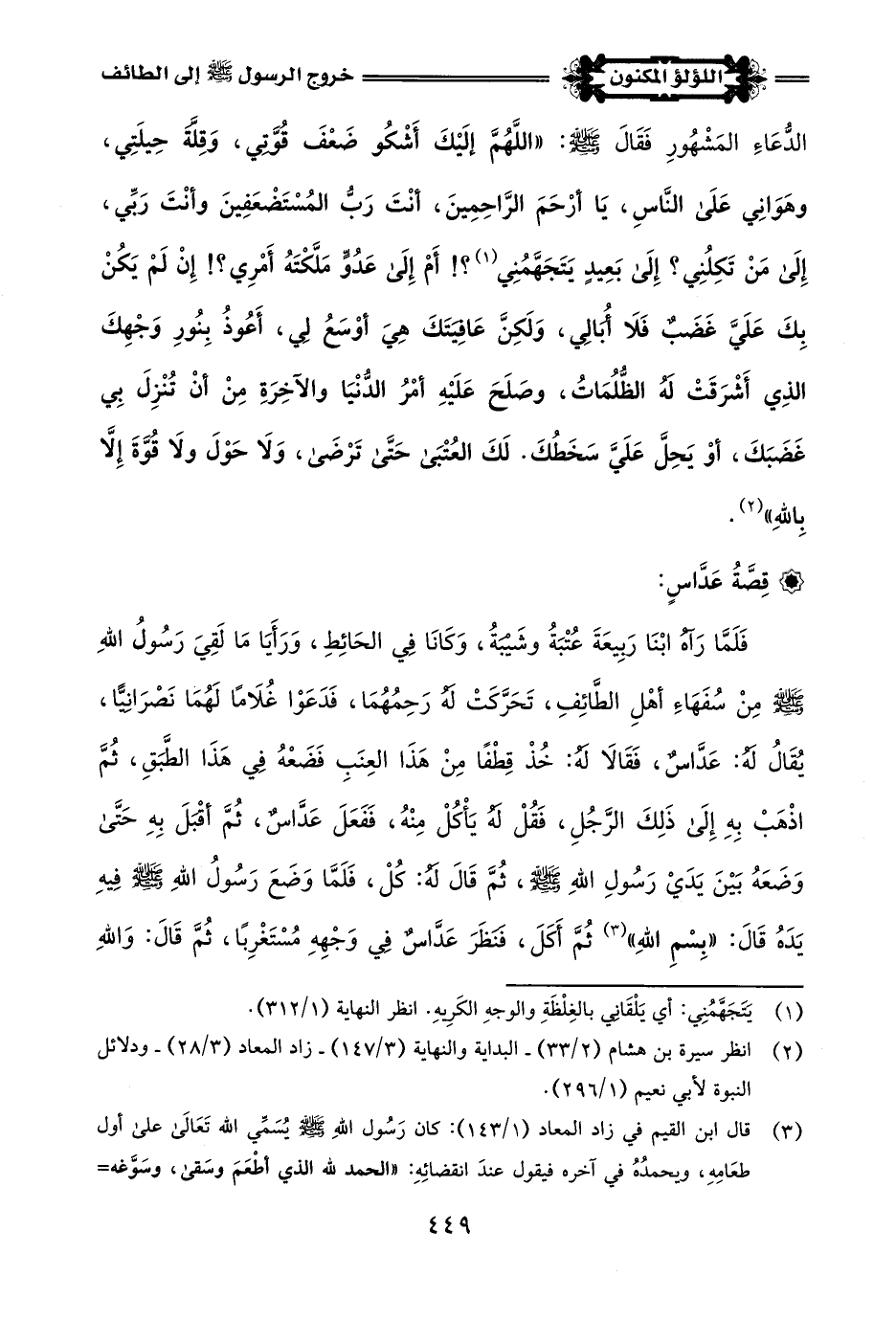 الدُّعَاءِ المَشْهُورِ فَقَالَ -صلى اللَّه عليه وسلم-: "اللَّهُمَّ إِلَيْكَ أَشْكُو ضَعْفَ قُوَّتِي، وَقِلَّةَ حِيلَتِي، وهَوَانِي عَلَى النَّاسِ، يَا أرْحَمَ الرَّاحِمِينَ، أَنْتَ رَبُّ المُسْتَضْعَفِينَ وَأَنْتَ رَبِّي، إِلَى مَنْ تَكِلُنِي؟ إِلَى بَعِيدٍ يَتَجَهَّمُنِي (¬1)؟ ! أَمْ إِلَى عَدُوٍّ مَلَّكْتَهُ أَمْرِي؟ ! إِنْ لَمْ يَكُنْ بِكَ عَلَيَّ غَضَبٌ فَلَا أُبَالِي، وَلَكِنَّ عَافِيَتَكَ هِيَ أوْسَعُ لِي، أَعُوذُ بِنُورِ وَجْهِكَ الذِي أَشْرَقَتْ لَهُ الظُّلُمَاتُ، وصَلَحَ عَلَيْهِ أمْرُ الدُّنْيَا والَآخِرَةِ مِنْ أَنْ تُنْزِلَ بِي غَضَبَكَ، أَوْ يَحِلَّ عَلَيَّ سَخَطُكَ. لَكَ العُتْبَى حَتَّى تَرْضَى، وَلَا حَوْلَ ولَا قُوَّةَ إِلَّا بِاللَّهِ" (¬2)