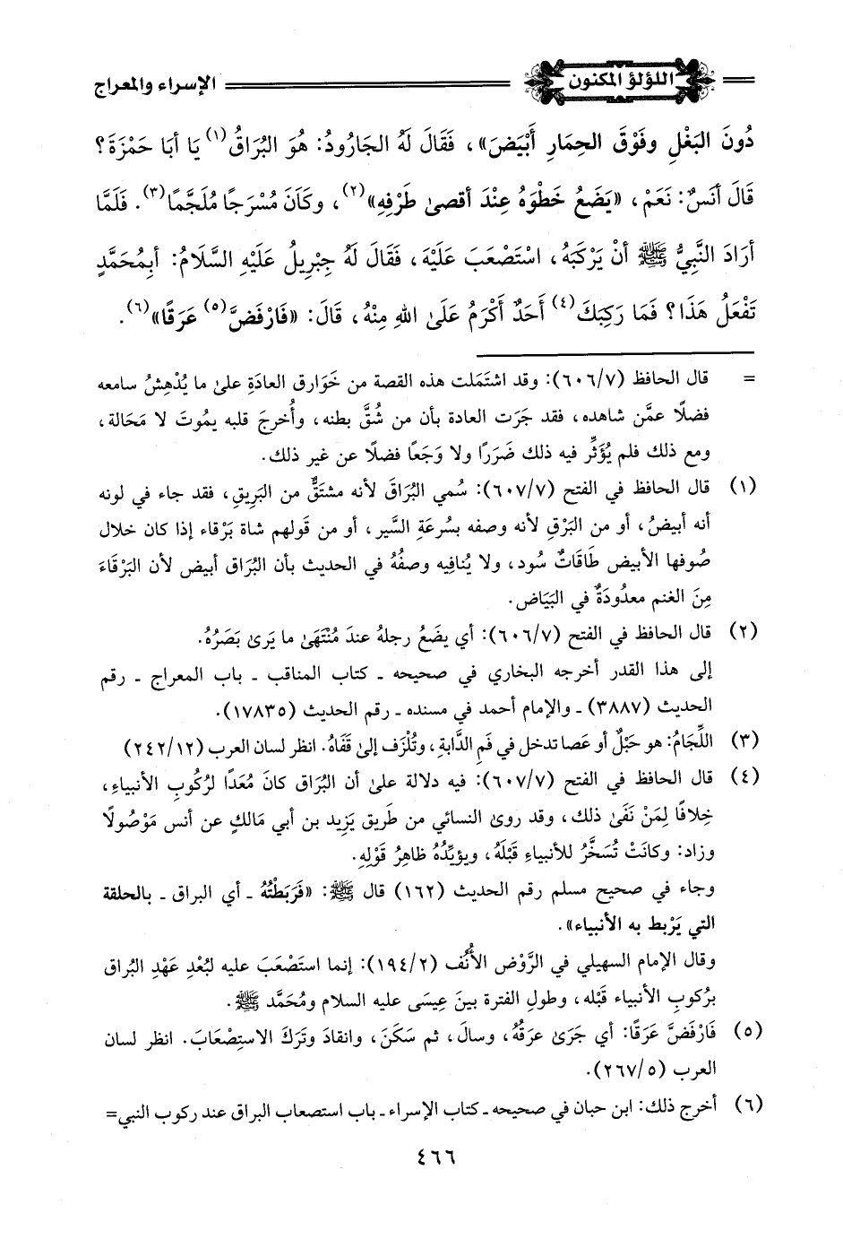 (¬1) قال الحافظ في الفتح (7/ 607): سُمي البُرَاقَ لأنه مشتَقٌّ من البَرِيقِ، فقد جاء في لونه أنه أبيضُ، أو من البَرْقِ لأنه وصفه بسُرعَةِ السَّير، أو من قَولهم شاة بَرْقاء إذا كان خلال صُوفها الأبيض طَاقَاتٌ سُود، ولا يُنافِيه وصفُهُ في الحديث بأن البُرَاق أبيض لأن البَرْقَاءَ مِنَ الغنم معدُودَةٌ في البَيَاض.