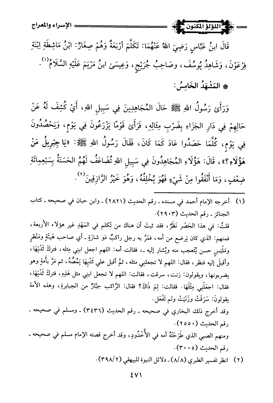 وَرَأَى رَسُولُ اللَّهِ -صلى اللَّه عليه وسلم- حَالَ المُجَاهِدِينَ فِي سَبِيلِ اللَّهِ، أَيْ كُشِفَ لَهُ عَنْ حَالِهِمْ فِي دَارِ الجَزَاءِ بِضَرْبِ مِثَالِهِ، فَرَأَى قَوْمًا يَزْرَعُونَ فِي يَوْمٍ، وَيَحْصُدُونَ فِي يَوْمٍ، كُلَّمَا حَصَدُوا عَادَ كَمَا كَانَ، فَقَالَ رَسُولُ اللَّهِ -صلى اللَّه عليه وسلم-: "يَا جِبْرِيلُ مَنْ هَؤُلَاءِ؟ "، قَالَ: هَؤُلَاءِ المُجَاهِدُونَ فِي سَبِيلِ اللَّهِ تُضَاعَفُ لَهُمُ الحَسَنَةُ بِسَبْعِمِائَةِ ضِعْفٍ، وَمَا أَنْفَقُوا مِنْ شَيْءٍ فَهُوَ يُخْلِفُهُ، وَهُوَ خَيْرُ الرَّازِقِينَ (¬2).