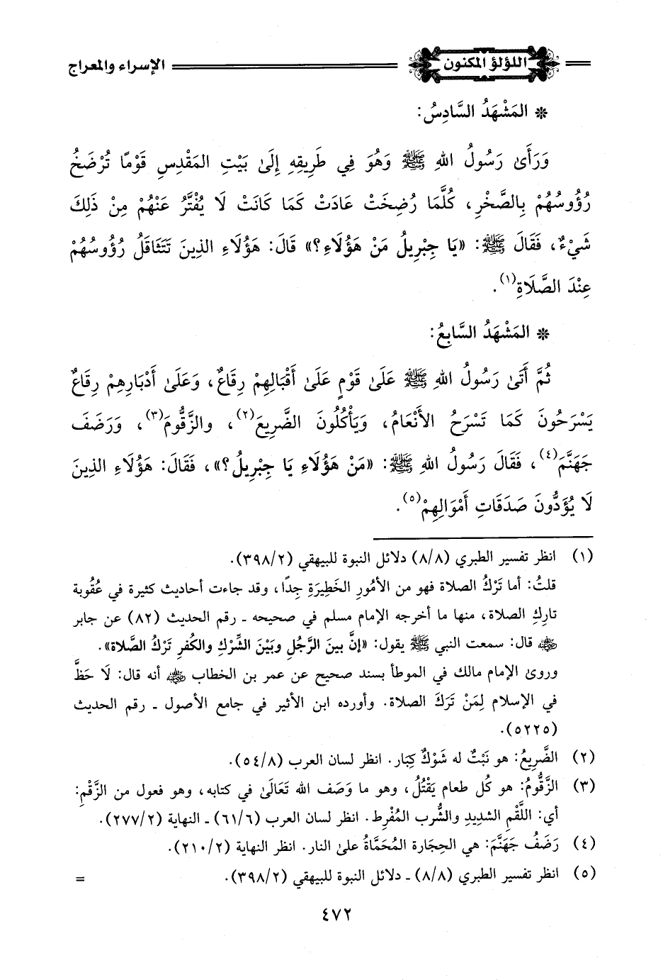 ثُمَّ أَتَى رَسُولُ اللَّهِ -صلى اللَّه عليه وسلم- عَلَى قَوْمٍ عَلَى أَقْبَالِهِمْ رِقَاعٌ، وَعَلَى أَدْبَارِهِمْ رِقَاعٌ يَسْرَحُونَ كَمَا تَسْرَحُ الأَنْعَامُ، وَيَأْكُلُونَ الضَّرِيعَ (¬2)، والزَّقُّومَ (¬3)، وَرَضَفَ جَهَنَّمَ (¬4) , فَقَالَ رَسُولُ اللَّهِ -صلى اللَّه عليه وسلم-: "مَنْ هَؤُلَاءِ يَا جِبْرِيلُ؟ "، فَقَالَ: هَؤُلَاءَ الذِينَ لَا يُؤَدُّونَ صَدَقَاتِ أَمْوَالِهِمْ (¬5).