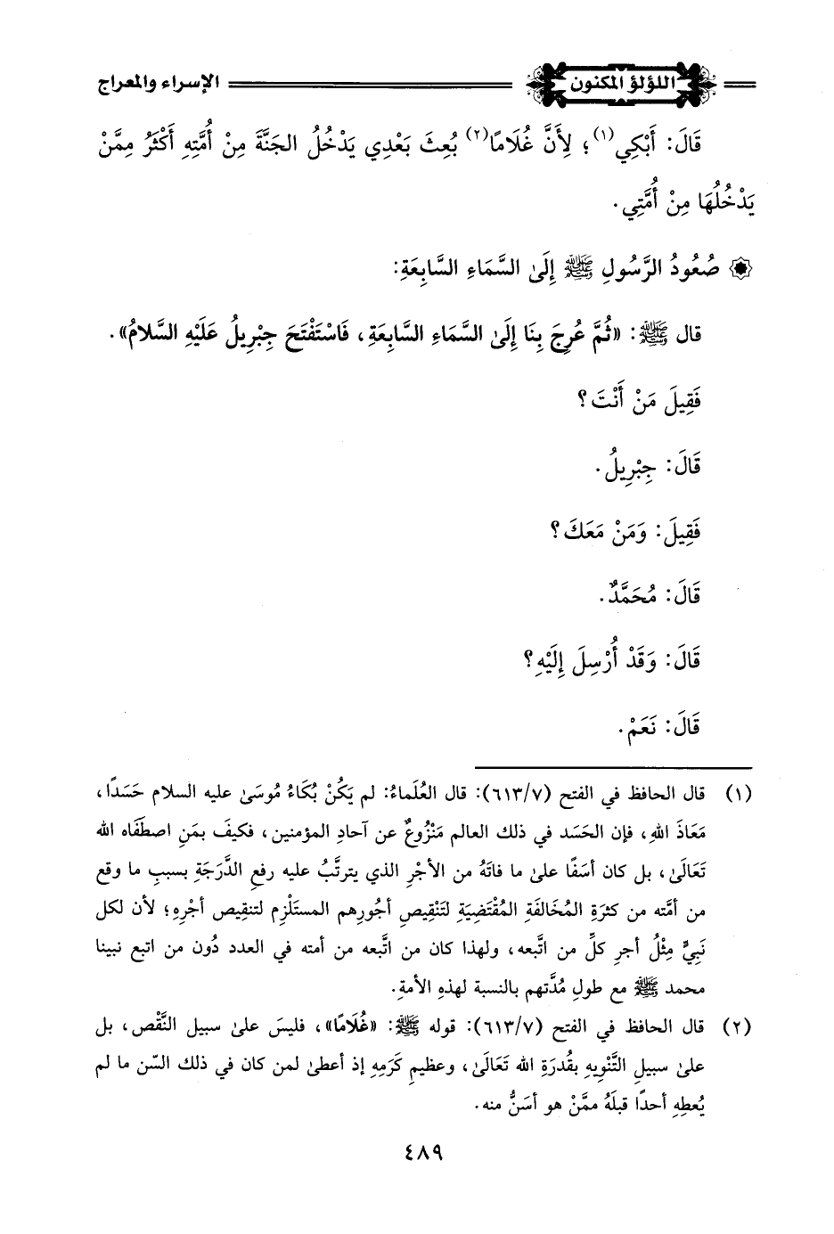 (¬1) قال الحافظ في الفتح (7/ 613): قال العُلَماءُ: لم يَكُنْ بُكَاءُ مُوسَى عليه السلام حَسَدًا، مَعَاذَ اللَّهِ، فإن الحَسَد في ذلك العالم مَنْزُوعٌ عن آحادِ المؤمنين، فكيفَ بمَنِ اصطَفَاه اللَّه تَعَالَى، بل كان أسَفًا على ما فاتَهُ من الأجْرِ الذي يترتَّبُ عليه رفعِ الدَّرَجَةِ بسببِ ما وقع من أمَّته من كثرَةِ المُخَالفَةِ المُقْتَضِيَةِ لتَنْقِيصِ أجُورِهم المستَلْزِم لتنقِيص أجْرِهِ؛ لأن لكل نَبِيٍّ مِثْلُ أجرِ كلِّ من اتَّبعه، ولهذا كان من اتَّبعه من أمته في العدد دُون من اتبع نبينا محمَّد -صلى اللَّه عليه وسلم- مع طولِ مُدَّتهم بالنسبة لهذهِ الأمةِ.