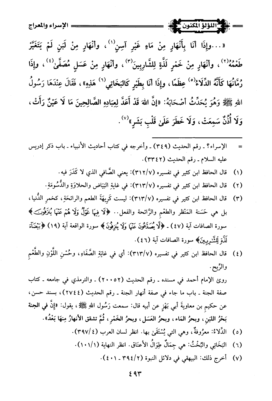 ". . . وإِذَا أنَا بِأَنْهَارٍ مِنْ مَاءٍ غَيْرِ آسِنٍ (¬1)، وأنْهَارٍ مِنْ لَبَنٍ لَمْ يَتَغَيَّرْ طَعْمُهُ (¬2)، وأنْهَارٍ مِنْ خَمْرٍ لَذَّةٍ لِلشَّارِبِينَ (¬3)، وأنْهَارٍ مِنْ عَسَلٍ مُصَفَّى (¬4)، وإِذَا رُمَّانُهَا كَأَنَّهُ الدِّلَاءُ (¬5) عِظَمًا، وإِذَا أنَا بِطَيْرٍ كَالَبخَاتِي (¬6) هَذِهِ"، فَقَالَ عِنْدَهَا رَسُولُ اللَّهِ -صلى اللَّه عليه وسلم- وَهُوَ يُحَدِّثُ أصْحَابَهُ: "إِنَّ اللَّهَ قَدْ أَعَدَّ لِعِبَادِهِ الصَّالِحِينَ مَا لَا عَيْنٌ رَأَتْ، وَلَا أُذُنٌ سَمِعَتْ، وَلَا خَطَرَ عَلَى قَلْبِ بَشَرٍ" (¬7).