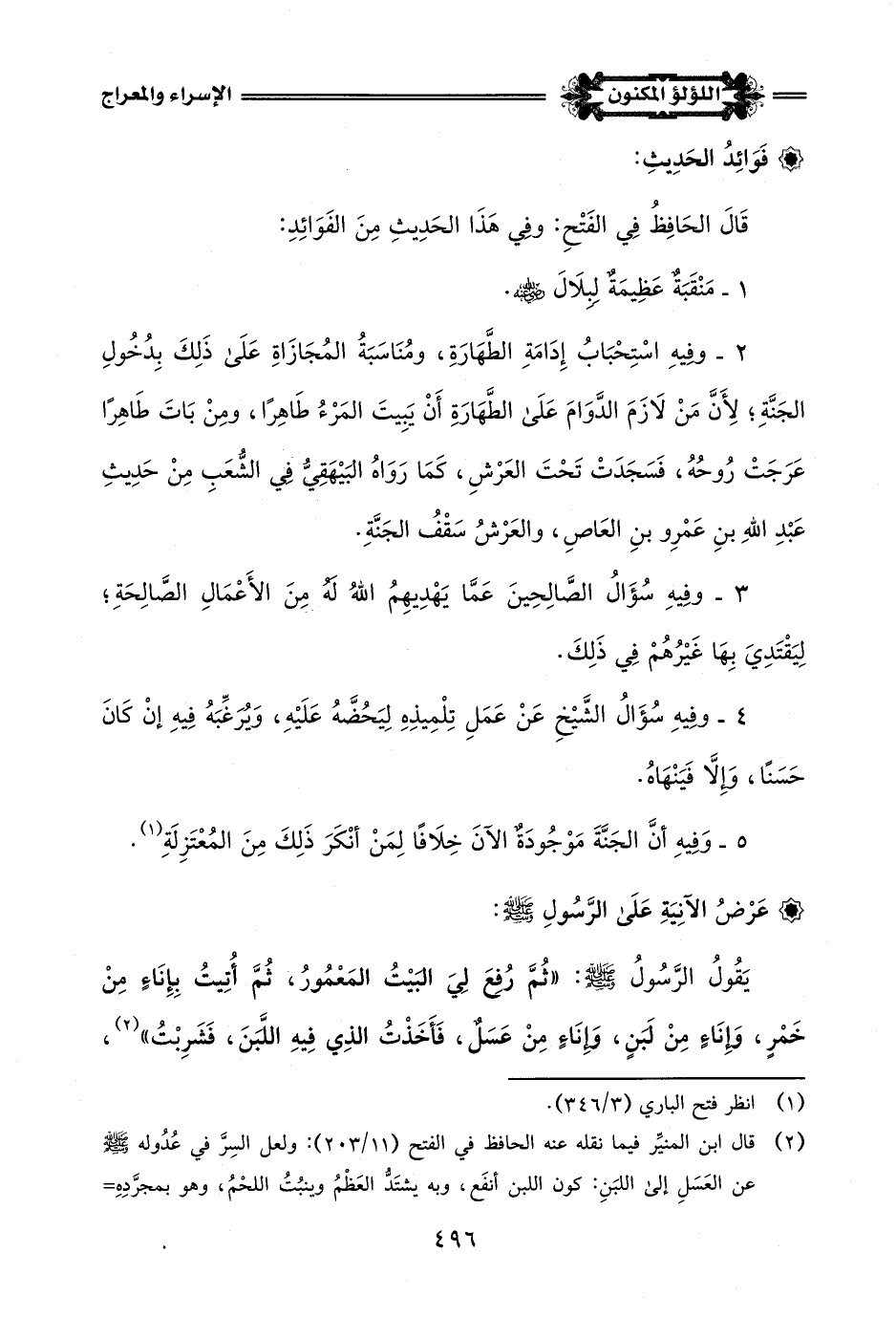 يَقُولُ الرَّسُولُ -صلى اللَّه عليه وسلم-: "ثُمَّ رُفِعَ لِيَ البَيْتُ المَعْمُورُ، ثُمَّ أُتِيتُ بِإِنَاءٍ مِنْ خَمْرٍ، وَإِنَاءٍ مِنْ لَبَنٍ، وَإِنَاءٍ مِنْ عَسَلٌ، فَأَخَذْتُ الذِي فِيهِ اللَّبَنَ، فَشَرِبْتُ" (¬2)،