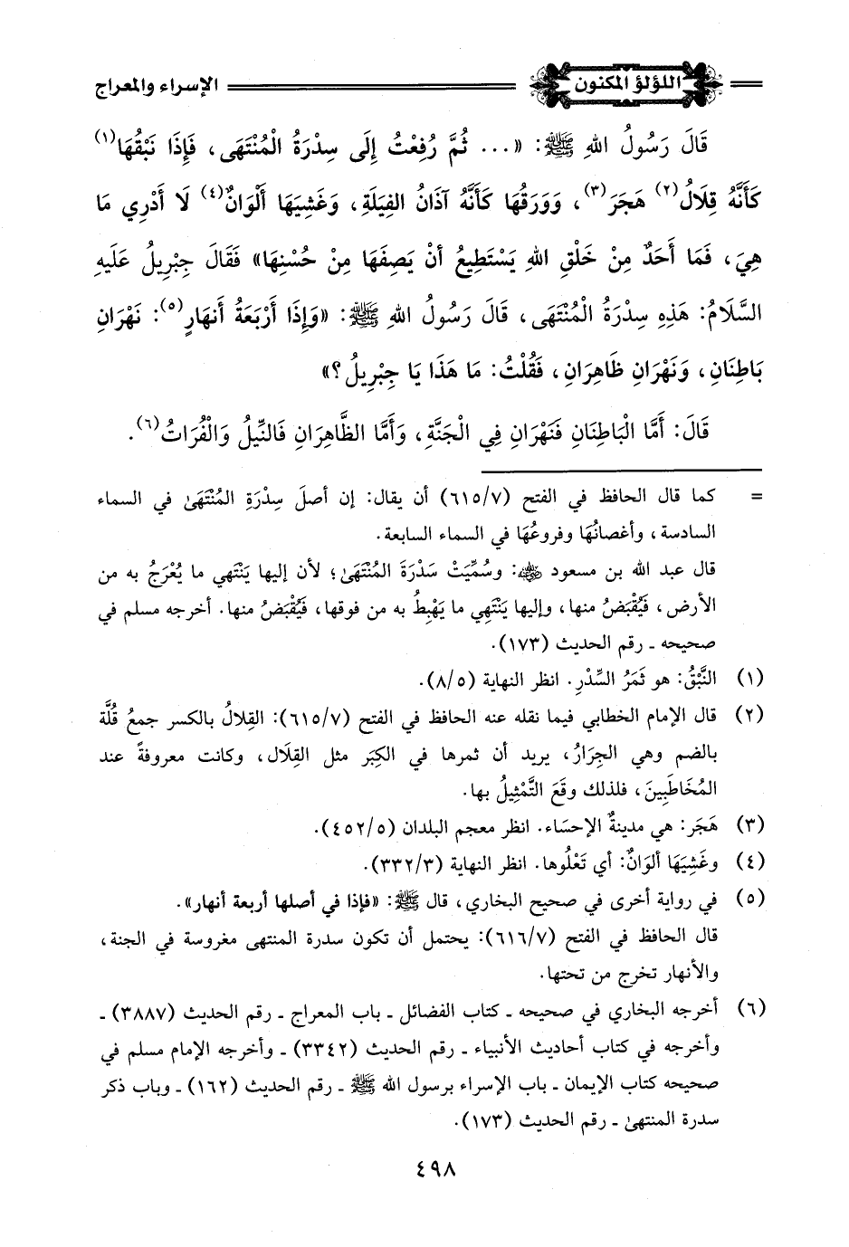 (¬6) أخرجه البخاري في صحيحه - كتاب الفضائل - باب المعراج - رقم الحديث (3887) - وأخرجه في كتاب أحاديث الأنبياء - رقم الحديث (3342) - وأخرجه الإِمام مسلم في صحيحه كتاب الإيمان - باب الإسراء برسول اللَّه -صلى اللَّه عليه وسلم- رقم الحديث (162) - وباب ذكر سدرة المنتهى - رقم الحديث (173).