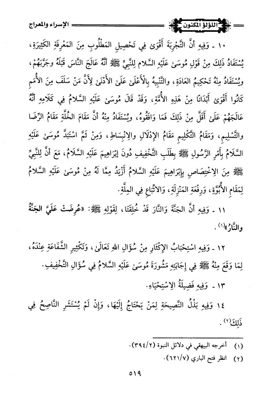 10 - وَفِيهِ أَنَّ التَّجْرِبَةَ أَقْوَى فِي تَحْصِيلِ المَطْلُوبِ مِنَ المَعْرِفَةِ الكَثِيرَةِ، يُسْتَفَادُ ذَلِكَ مِنْ قَوْلِ مُوسَى عَلَيْهِ السَّلام لِلنَّبِيِّ -صلى اللَّه عليه وسلم- أَنَّهُ عَالَجَ النَّاسَ قَبْلَهُ وجَرَّبَهُمْ، ويُسْتَفَادُ مِنْهُ تَحْكِيمُ العَادَةِ، والتَّنْبِيهُ بِالْأَعْلَى عَلَى الأَدْنَى لِأَنَّ مَنْ سَلَفَ مِنَ الأُمَمِ كَانُوا أَقْوَى أَبْدَانًا مِنْ هَذِهِ الأُمَّةِ، وَقَدْ قَالَ مُوسَى عَلَيْهِ السَّلامُ فِي كَلَامِهِ أَنَّهُ عَالَجَهُمْ عَلَى أَقَلَّ مِنْ ذَلِكَ فَمَا وَافَقُوهُ، ويُسْتَفَادُ مِنْهُ أَنَّ مَقَامَ الخُلَّةِ مَقَامُ الرِّضَا والتَّسْلِيمِ، وَمَقَامُ التَّكْلِيمِ مَقَامُ الإِدْلَالِ والِانْبِسَاطِ، وَمِنْ ثَمَّ اسْتَبَدَّ مُوسَى عَلَيْهِ السَّلَامُ بِأَمْرِ الرَّسُولِ -صلى اللَّه عليه وسلم- بِطَلَبِ التَّخْفِيفِ دُونَ إبْرَاهِيمَ عَلَيْهِ السَّلَامُ، مَعَ أَنَّ لِلنَّبِيِّ -صلى اللَّه عليه وسلم- مِنَ الِاخْتِصَاصِ بِإِبْرَاهِيمَ عَلَيْهِ السَّلامُ أَزْيَدُ مِمَّا لَهُ مِنْ مُوسَى عَلَيْهِ السَّلامُ لِمَقَامِ الأُبُوَّةِ، وَرِفْعَةِ المَنْزِلَةِ، وَالاتِّبَاعِ فِي المِلَّةِ.