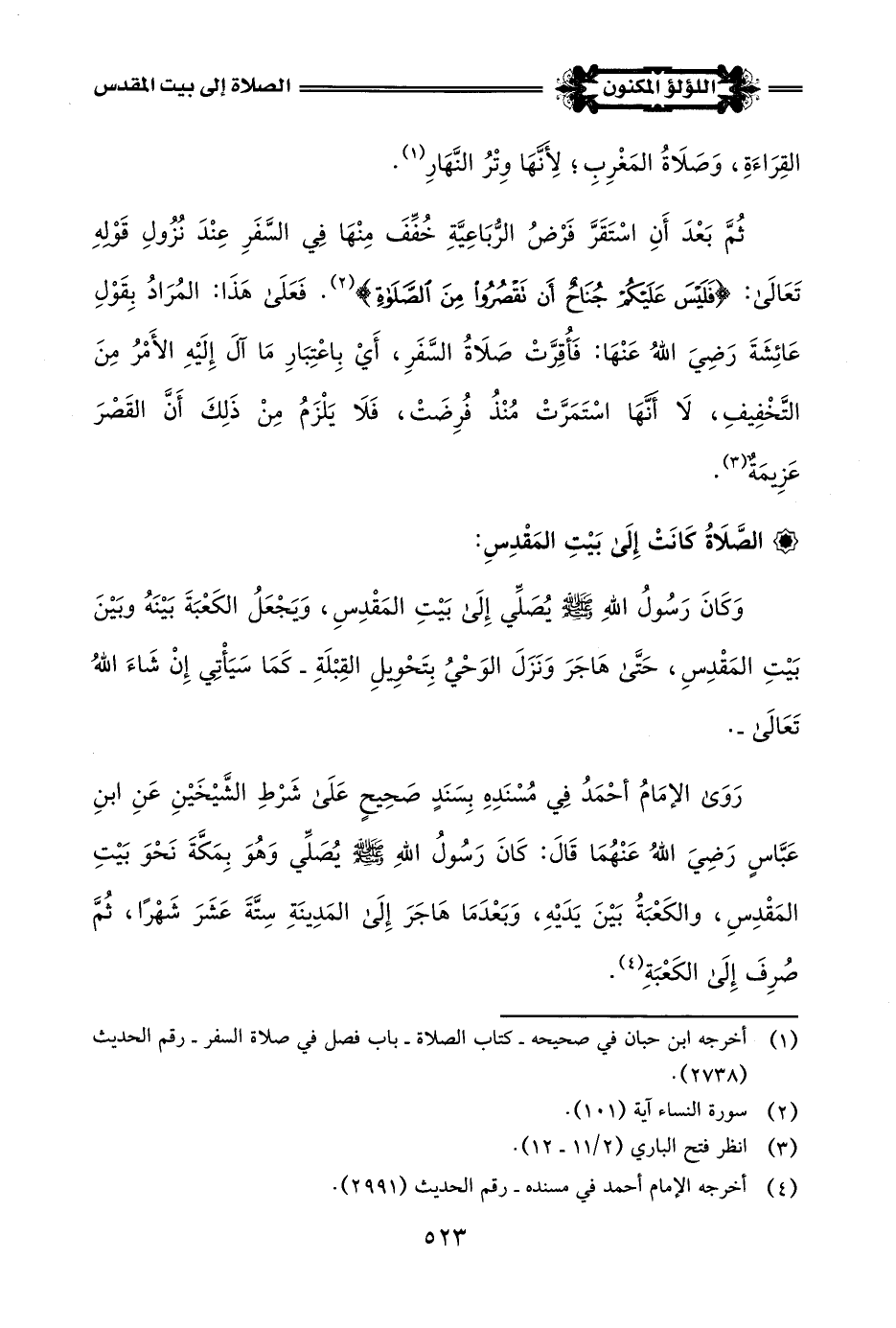 رَوَى الإِمَامُ أَحْمَدُ فِي مُسْنَدِهِ بِسَنَدٍ صَحِيحٍ عَلَى شَرْطِ الشَّيْخَيْنِ عَنِ ابنِ عَبَّاسٍ رَضِيَ اللَّهُ عَنْهُمَا قَالَ: كَانَ رَسُولُ اللَّهِ -صلى اللَّه عليه وسلم- يُصَلِّي وَهُوَ بِمَكَّةَ نَحْوَ بَيْتِ المَقْدِسِ، والكَعْبَةُ بَيْنَ يَدَيْهِ، وَبَعْدَمَا هَاجَرَ إِلَى المَدِينَةِ سِتَّةَ عَشَرَ شَهْرًا، ثُمَّ صُرِفَ إِلَى الكَعْبَةِ (¬4).
