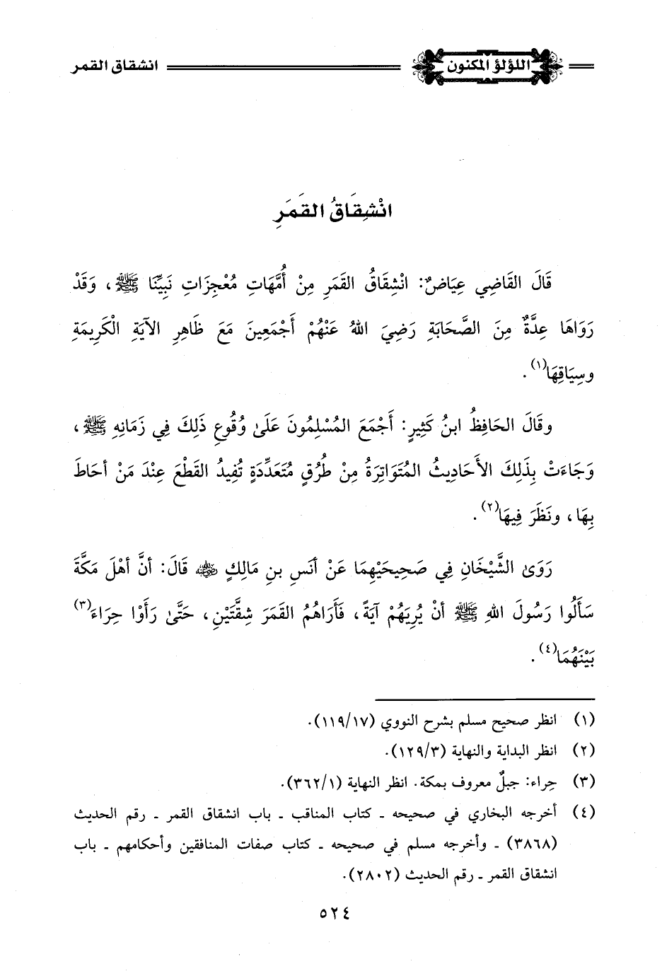 (¬4) أخرجه البخاري في صحيحه - كتاب المناقب - باب انشقاق القمر - رقم الحديث (3868) - وأخرجه مسلم في صحيحه - كتاب صفات المنافقين وأحكامهم - باب انشقاف القمر - رقم الحديث (2802).