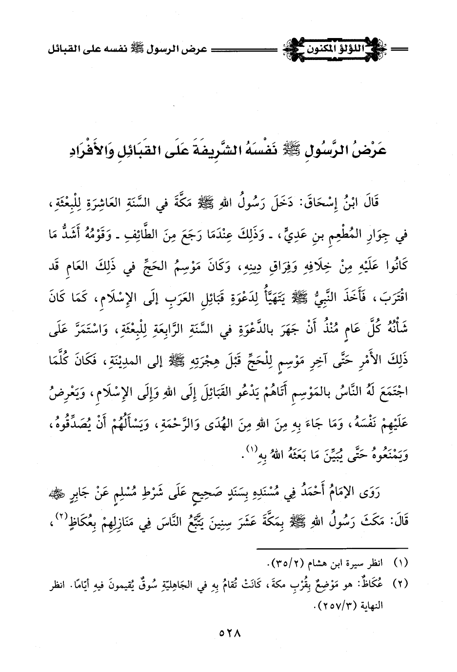 رَوَى الإِمَامُ أَحْمَدُ فِي مُسْنَدِهِ بِسَنَدٍ صَحِيحٍ عَلَى شَرْطِ مُسْلِمٍ عَنْ جَابِرٍ -رضي اللَّه عنه- قَالَ: مَكَثَ رَسُولُ اللَّهِ -صلى اللَّه عليه وسلم- بِمَكَّةَ عَشَرَ سِنِينَ يَتَّبَّعُ النَّاسَ فِي مَنَازِلهمْ بِعُكَاظٍ (¬2) ,