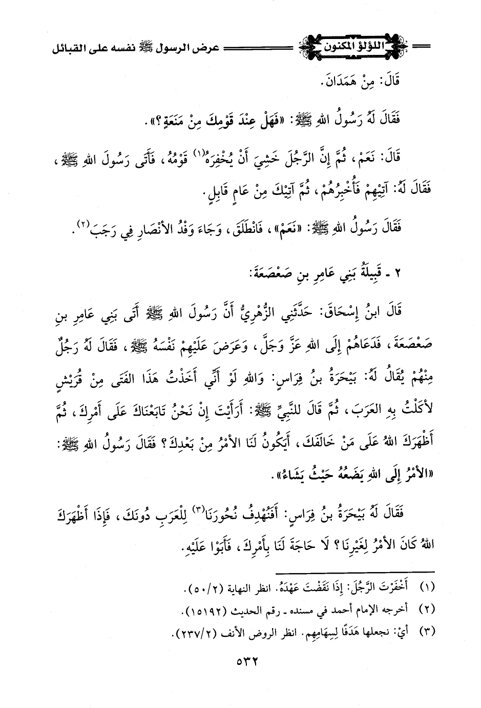 قَالَ ابنُ إِسْحَاقَ: حَدَّثَنِي الزُّهْرِيُّ أَنَّ رَسُولَ اللَّهِ -صلى اللَّه عليه وسلم- أَتَى بَنِي عَامِرِ بنِ صَعْصَعَةَ، فَدَعَاهُمْ إِلَى اللَّهِ عَزَّ وَجَلَّ، وَعَرَضَ عَلَيْهِمْ نَفْسَهُ -صلى اللَّه عليه وسلم-، فَقَالَ لَهُ رَجُلٌ مِنْهُمْ يُقَالُ لَهُ: بَيْحَرَةُ بنُ فِرَاسٍ: وَاللَّهِ لَوْ أَنِّي أَخَذْتُ هَذَا الفَتَى مِنْ قُرَيْشٍ لأكَلْتُ بِهِ العَرَبَ، ثُمَّ قَالَ للنَّبِيِّ -صلى اللَّه عليه وسلم-: أَرَأَيْتَ إِنْ نَحْنُ تَابَعْنَاكَ عَلَى أَمْرِكَ، ثُمَّ أَظْهَرَكَ اللَّهُ عَلَى مَنْ خَالفَكَ، أَيَكُونُ لَنَا الأمْرُ مِنْ بَعْدِكَ؟ فَقَالَ رَسُولُ اللَّهِ -صلى اللَّه عليه وسلم-: "الأمْرُ إِلَى اللَّهِ يَضَعُهُ حَيْثُ يَشَاءُ".