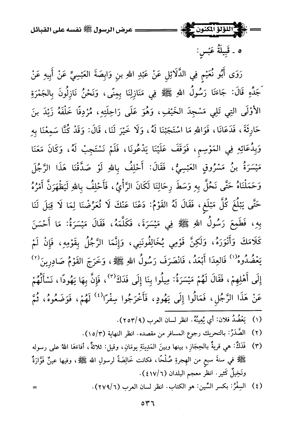 رَوَى أَبُو نُعَيْمٍ فِي الدَّلَائِلِ عَنْ عَبْدِ اللَّهِ بنِ وَابِصَةَ العَبْسِيِّ عَنْ أَبِيهِ عَنْ جَدِّهِ قَالَ: جَاءَنَا رَسُولُ اللَّهِ -صلى اللَّه عليه وسلم- فِي مَنَازِلِنَا بِمِنًى، وَنَحْنُ نَازِلُونَ بِالجَمْرَةِ الأوْلَى التِي تَلِي مَسْجِدَ الخَيْفِ، وَهُوَ عَلَى رَاحِلَتِهِ، مُرْدِفًا خَلْفَهُ زَيْدَ بنَ حَارِثَةَ، فَدَعَانَا، فَوَاللَّهِ مَا اسْتَجَبْنَا لَهُ، وَلَا خَيْرَ لَنَا، قَالَ: وَقَدْ كُنَّا سَمِعْنَا بِهِ وَبِدُعَائِهِ فِي المَوْسِمِ، فَوَقَفَ عَلَيْنَا لَدْعُونَا، فَلَمْ نَسْتَجِبْ لَهُ، وَكَانَ مَعَنَا مَيْسَرَةُ بنُ مَسْرُوقٍ العَبْسِيُّ، فَقَالَ: أَحْلِفُ بِاللَّهِ لَوْ صَدَّقْنَا هَذَا الرَّجُلَ وَحَمَلْنَاهُ حَتَّى نَحُلَّ بِهِ وَسَطَ رِحَالِنَا لَكَانَ الرَّأْيُ، فَأَحْلِفُ بِاللَّهِ لَيَظْهَرَنَّ أَمْرُهُ حَتَّى يَبْلُغَ كُلَّ مَبْلَغٍ، فَقَالَ لَهُ القَوْمُ: دَعْنَا عَنْكَ لَا تُعَرِّضْنَا لِمَا لَا قِبَلَ لَنَا بِهِ، فَطَمعَ رَسُولُ اللَّهِ -صلى اللَّه عليه وسلم- فِي مَيْسَرَةَ، فكَلَّمَهُ، فَقَالَ مَيْسَرَةُ: مَا أَحْسَنَ كَلَامَكَ وَأَنْوَرَهُ، وَلَكِنَّ قَوْمِي يُخَالِفُونَنِي، وَإِنَّمَا الرَّجُلُ بِقَوْمِهِ، فَإِنْ لَمْ يَعْضُدُوهُ (¬1) فَالعِدَا أَبْعَدُ، فَانْصَرَفَ رَسُولُ اللَّهِ -صلى اللَّه عليه وسلم-، وَخَرَجَ القَوْمُ صَادِرِينَ (¬2) إِلَى أَهْلِهِمْ، فَقَالَ لَهُمْ مَيْسَرَهُ: مِيلُوا بِنَا إِلَى فَدَكَ (¬3)، فَإِنَّ بِهَا يَهُودًا، نَسْأَلُهُمْ عَنْ هَذَا الرَّجُلِ، فَمَالُوا إِلَى يَهُودٍ، فَأَخْرَجُوا سِفْرًا (¬4) لَهُمْ، فَوَضَعُوهُ، ثُمَّ