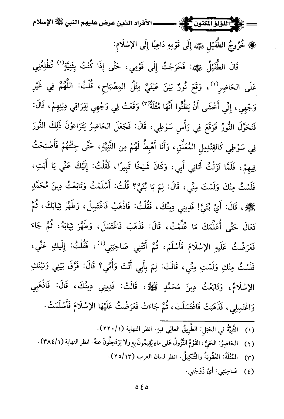 قَالَ الطُّفَيْلُ -رضي اللَّه عنه-: فَخَرَجْتُ إِلَى قَوْمِي، حَتَّى إِذَا كُنْتُ بِثَنِيَّةٍ (¬1) تُطْلِعُنِي عَلَى الحَاضِرِ (¬2)، وَقَعَ نُورٌ بَيْنَ عَيْنَيَّ مِثْلُ المِصْبَاحِ، قُلْتُ: اللَّهُمَّ فِي غَيْرِ وَجْهِي، إِنِّي أَخْشَى أَنْ يَظُنُّوا أَنَّهَا مُثْلَةٌ (¬3) وَقَعَتْ فِي وَجْهِي لِفِرَاقِي دِيْنِهِمْ، قَالَ: فتَحَوَّلَ النُّورُ فَوَقَعَ فِي رَأْسِ سَوْطِي، قَالَ: فَجَعَلَ الحَاضِرُ يَترَاءَوْنَ ذَلِكَ النُّورَ فِي سَوْطِي كَالقِنْدِيلِ المُعَلَّقِ، وَأَنَا أَهْبِطُ لَهُمْ مِنْ الثَّنِيَّةِ، حَتَّى جِئْتُهُمْ فَأَصْبَحْتُ فِيهِمْ، فَلَمَّا نَزَلْتُ أَتَانِي أَبِي، وَكَانَ شَيْخًا كَبِيرًا، فَقُلْتُ: إِلَيْكَ عَنِّي يَا أَبَتِ، فَلَسْتُ مِنْكَ وَلَسْتَ مِنِّي، قَالَ: لِمَ يَا بُنَيَّ؟ قُلْتُ: أَسْلَمْتُ وَتَابَعْتُ دِينَ مُحَمَّدٍ -صلى اللَّه عليه وسلم-، قَالَ: أَيْ بُنَيَّ! فَدِينِي دِينُكَ، فَقُلْتُ: فَاذْهَبْ فَاغْتَسِلْ، وَطَهِّرْ ثِيَابَكَ، ثُمَّ تَعَالَ حَتَّى أُعَلِّمَكَ مَا عُلِّمْتُ، قَالَ: فَذَهَبَ فَاغْتَسَلَ، وَطَهَّرَ ثِيَابَهُ، ثُمَّ جَاءَ فَعَرَضْتُ عَلَيهِ الإِسْلَامَ فَأَسْلَمَ، ثُمَّ أَتَتْنِي صَاحِبَتِي (¬4)، فَقُلْتُ: إِلَيكِ عَنِّي، فَلَسْتُ مِنْكِ وَلَسْتِ مِنِّي، قَالَتْ: لِمَ بِأَبِي أَنْتَ وَأُمِّي؟ قَالَ: فَرَّقَ بَيْنِي وَبَيْنَكِ الإِسْلَامُ، وَتَابَعْتُ ديِنَ مُحَمَّدٍ -صلى اللَّه عليه وسلم-، قَالَتْ: فَدِينِي دِينُكَ، قَالَ: فَاذْهَبِي وَاغْتَسِلِي، فَذَهَبَتْ فَاغْتَسَلَتْ، ثُمَّ جَاءَتْ فَعَرَضْتُ عَلَيْهَا الإِسْلَامَ فَأَسْلَمَتْ.