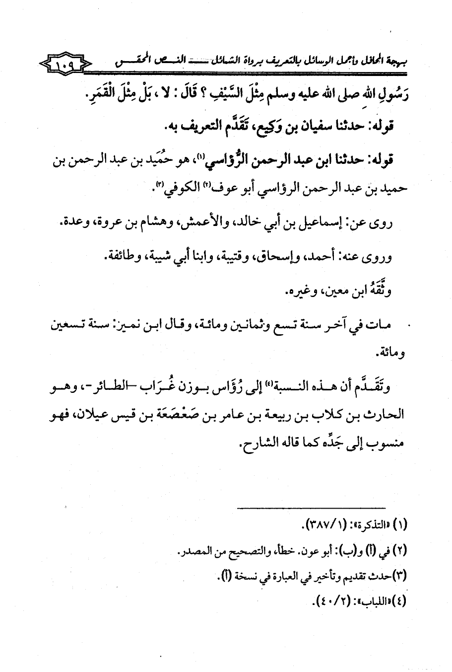 وتَقَدَّم أن هذه النسبة (¬4) إلى رُؤَاس بوزن غُرَاب -الطائر-، وهو الحارث بن كلاب بن ربيعة بن عامر بن صَعْصَعَة بن قيس عيلان، فهو منسوب إلى جَدِّه كما قاله الشارح.