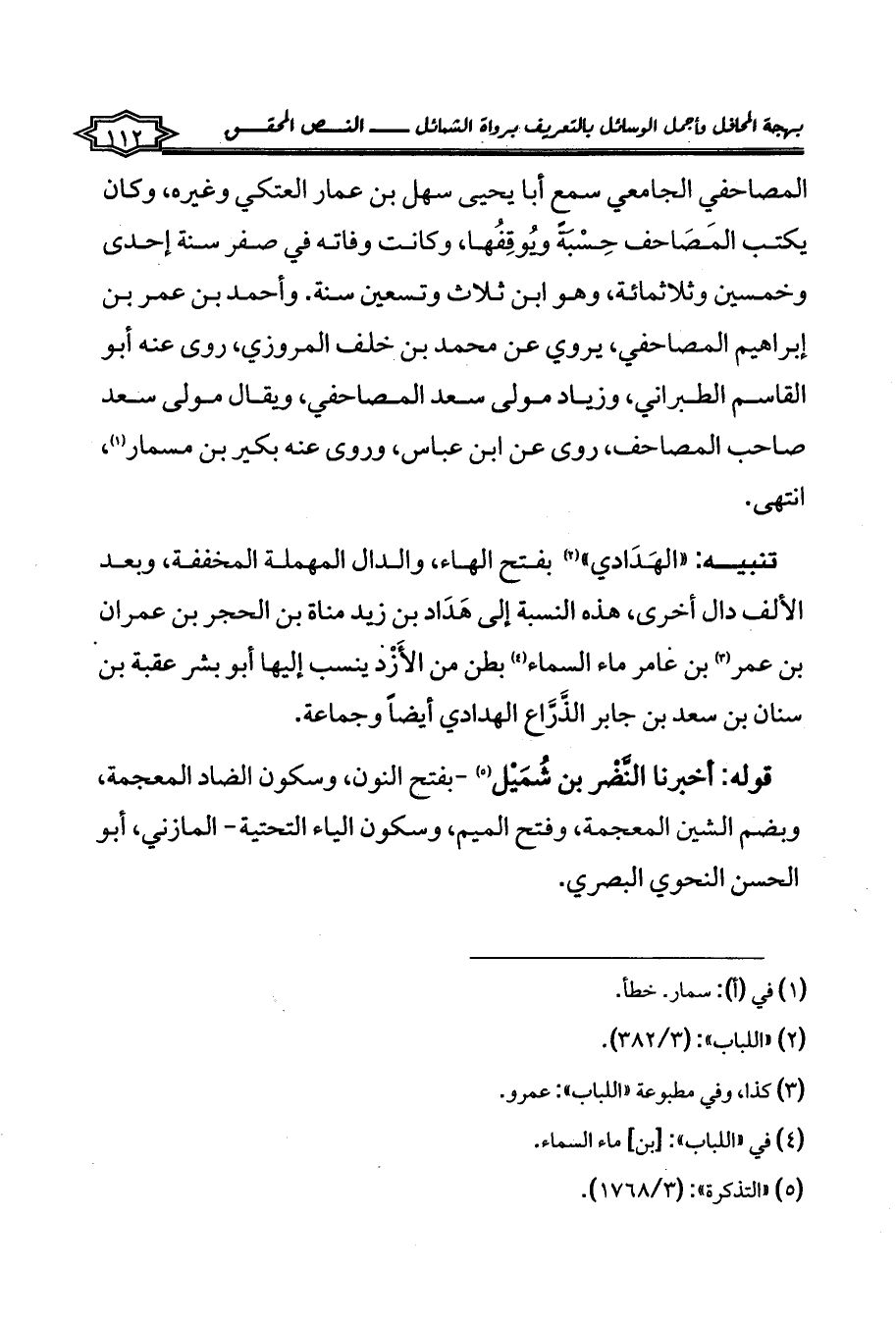 قوله: أخبرنا النَّضْر بن شُمَيْل (¬5) -بفتح النون، وسكون الضاد المعجمة، وبضم الشين المعجمة، وفتح الميم، وسكون الياء التحتية- المازني، أبو الحسن النحوي البصري.