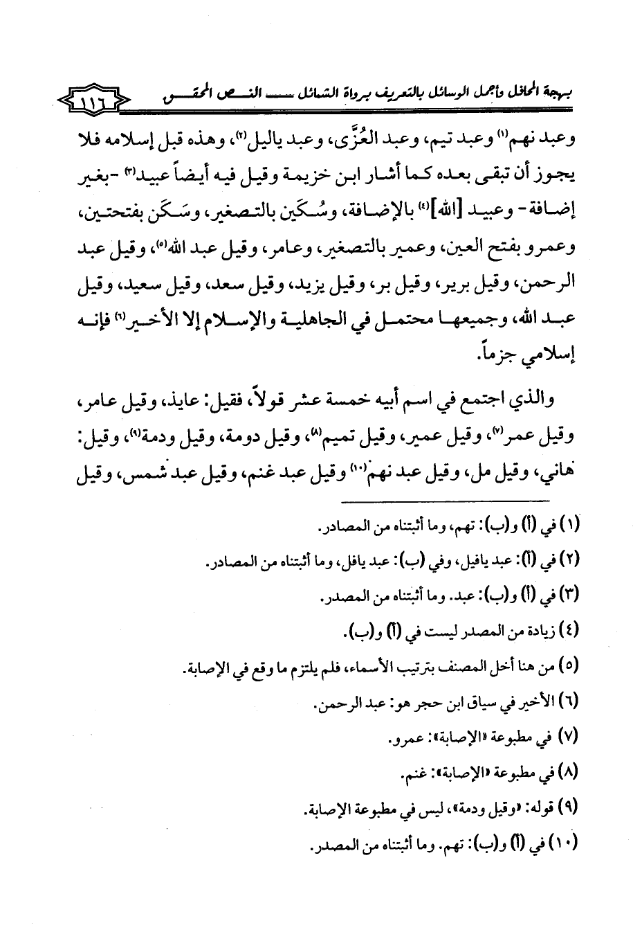 وعبد نهم (¬1) وعبد تيم، وعبد العُزَّى، وعبد ياليل (¬2)، وهذه قبل إسلامه فلا يجوز أن تبقى بعده كما أشار ابن خزيمة وقيل فيه أيضاً عبيد (¬3) -بغير إضافة- وعبيد [الله] (¬4) بالإضافة، وسُكَين بالتصغير، وسَكَن بفتحتين، وعمرو بفتح العين، وعمير بالتصغير، وعامر، وقيل عبد الله (¬5)، وقيل عبد الرحمن، وقيل برير، وقيل بر، وقيل يزيد، وقيل سعد، وقيل سعيد، وقيل عبد الله، وجميعها محتمل في الجاهلية والإسلام إلا الأخير (¬6) فإنه إسلامي جزماً.
