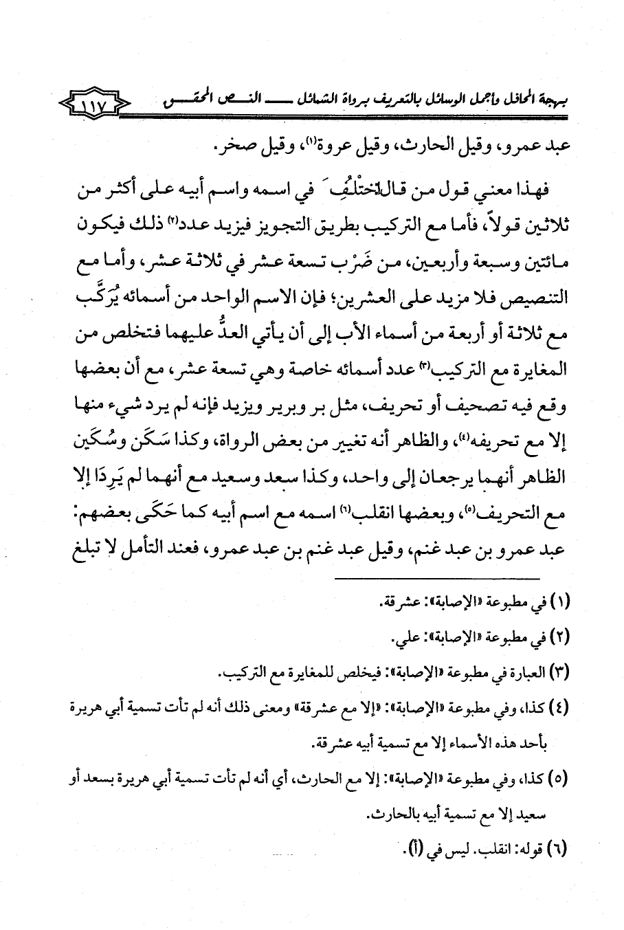 (¬4) كذا، وفي مطبوعة «الإصابة»: «إلا مع عشرقة» ومعنى ذلك أنه لم تأت تسمية أبي هريرة بأحد هذه الأسماء إلا مع تسمية أبيه عشرقة.