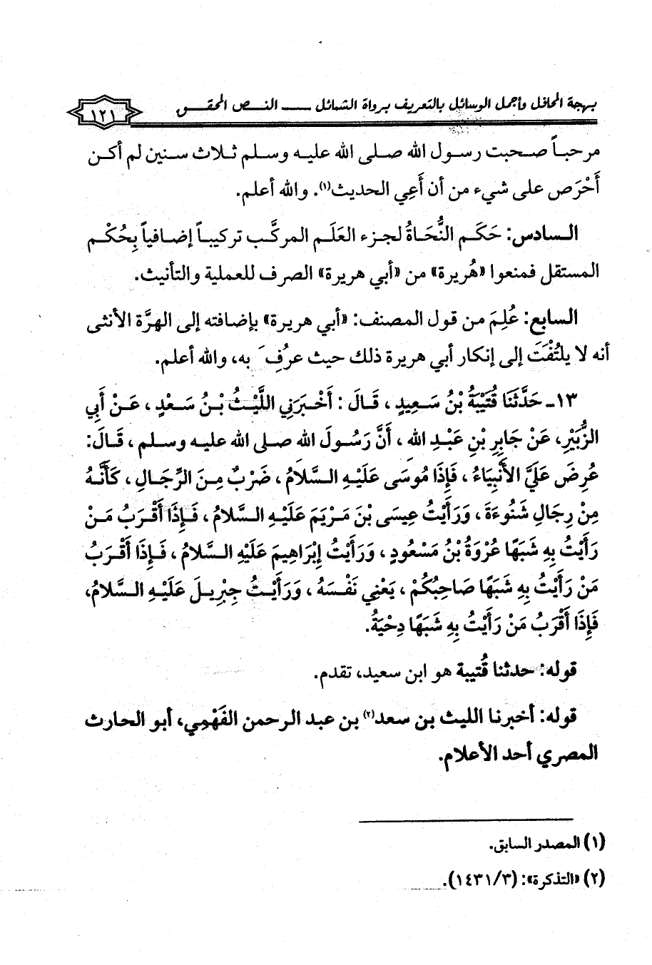 13 - حَدَّثَنَا قُتَيْبَةُ بْنُ سَعِيدٍ، قَالَ: أَخْبَرَنِي اللَّيْثُ بْنُ سَعْدٍ، عَنْ أَبِي الزُّبَيْرِ، عَنْ جَابِرِ بْنِ عَبْدِ اللهِ، أَنَّ رَسُولَ اللهِ صلى الله عليه وسلم، قَالَ: عُرِضَ عَلَيَّ الأَنْبِيَاءُ، فَإِذَا مُوسَى عَلَيْهِ السَّلامُ، ضَرْبٌ مِنَ الرِّجَالِ، كَأَنَّهُ مِنْ رِجَالِ شَنُوءَةَ، وَرَأَيْتُ عِيسَى بْنَ مَرْيَمَ عَلَيْهِ السَّلامُ، فَإِذَا أَقْرَبُ مَنْ رَأَيْتُ بِهِ شَبَهًا عُرْوَةُ بْنُ مَسْعُودٍ، وَرَأَيْتُ إِبْرَاهِيمَ عَلَيْهِ السَّلامُ، فَإِذَا أَقْرَبُ مَنْ رَأَيْتُ بِهِ شَبَهًا صَاحِبُكُمْ، يَعْنِي نَفْسَهُ، وَرَأَيْتُ جِبْرِيلَ عَلَيْهِ السَّلامُ، فَإِذَا أَقْرَبُ مَنْ رَأَيْتُ بِهِ شَبَهًا دِحْيَةُ.