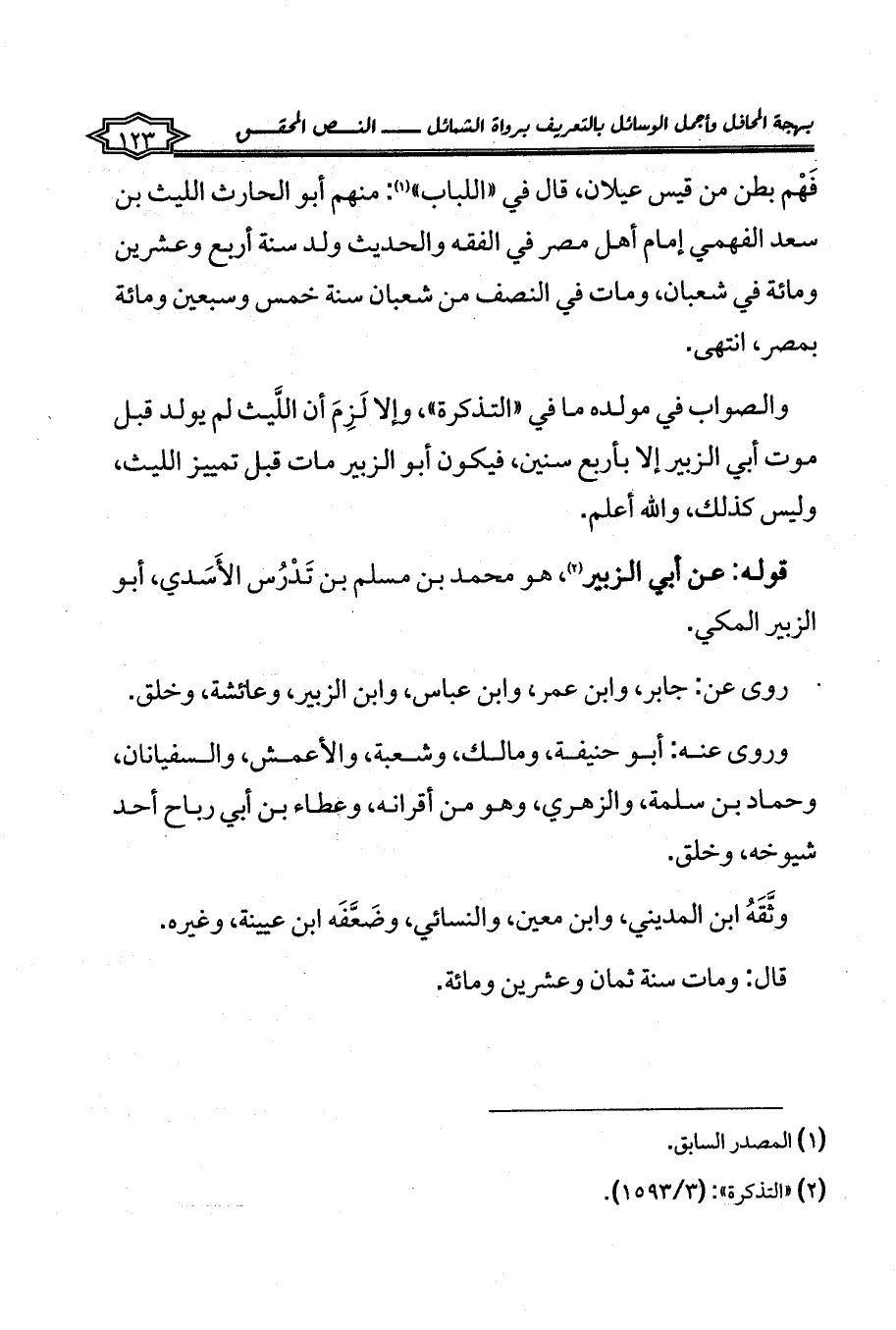 والصواب في مولده ما في «التذكرة»، وإلا لَزِمَ أن اللَّيث لم يولد قبل موت أبي الزبير إلا بأربع سنين، فيكون أبو الزبير مات قبل تمييز الليث، وليس كذلك، والله أعلم.