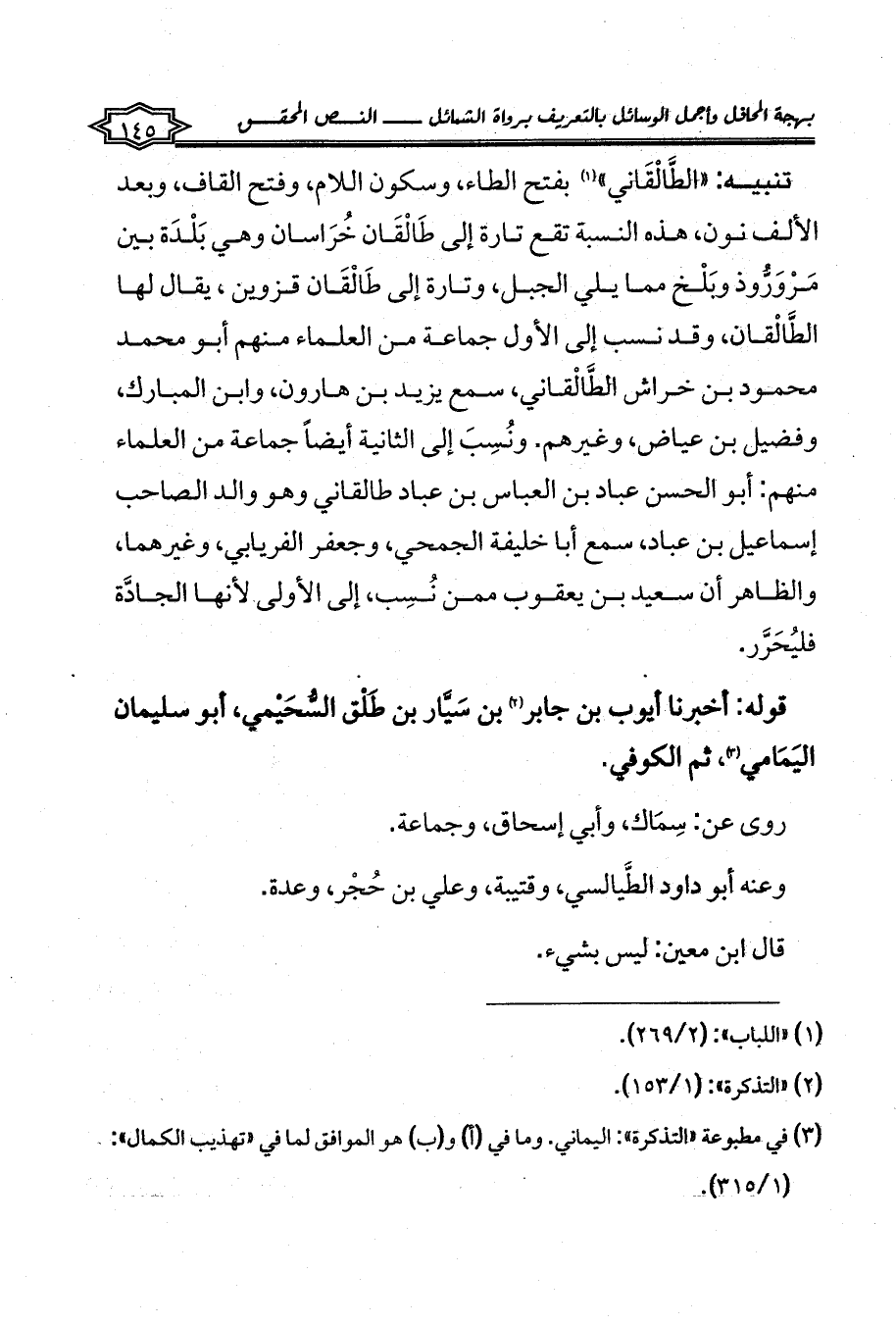 تنبيه: «الطَّالْقَاني» (¬1) بفتح الطاء، وسكون اللام، وفتح القاف، وبعد الألف نون، هذه النسبة تقع تارة إلى طَالْقَان خُرَاسان وهي بَلْدَة بين مَرْوَرُّوذ وبَلْخ مما يلي الجبل، وتارة إلى طَالْقَان قزوين، يقال لها الطَّالْقان، وقد نسب إلى الأول جماعة من العلماء منهم أبو محمد محمود بن خراش الطَّالْقاني، سمع يزيد بن هارون، وابن المبارك، وفضيل بن عياض، وغيرهم. ونُسِبَ إلى الثانية أيضاً جماعة من العلماء منهم: أبو الحسن عباد بن العباس بن عباد طالقاني وهو والد الصاحب إسماعيل بن عباد، سمع أبا خليفة الجمحي، وجعفر الفريابي، وغيرهما، والظاهر أن سعيد بن يعقوب ممن نُسِب، إلى الأولى لأنها الجادَّة فليُحَرَّر.