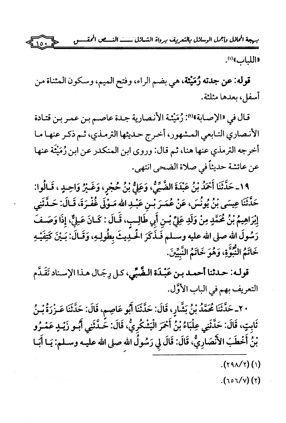 قال في «الإصابة» (¬2): رُمَيْثة الأنصارية جدة عاصم بن عمر بن قتادة الأنصاري التابعي المشهور، أخرج حديثها الترمذي، ثم ذكر عنها ما أخرجه الترمذي عنها هنا، ثم قال: وروى ابن المنكدر عن ابن رُمَيْثَة عنها عن عائشة حديثاً في صلاة الضحى انتهى.