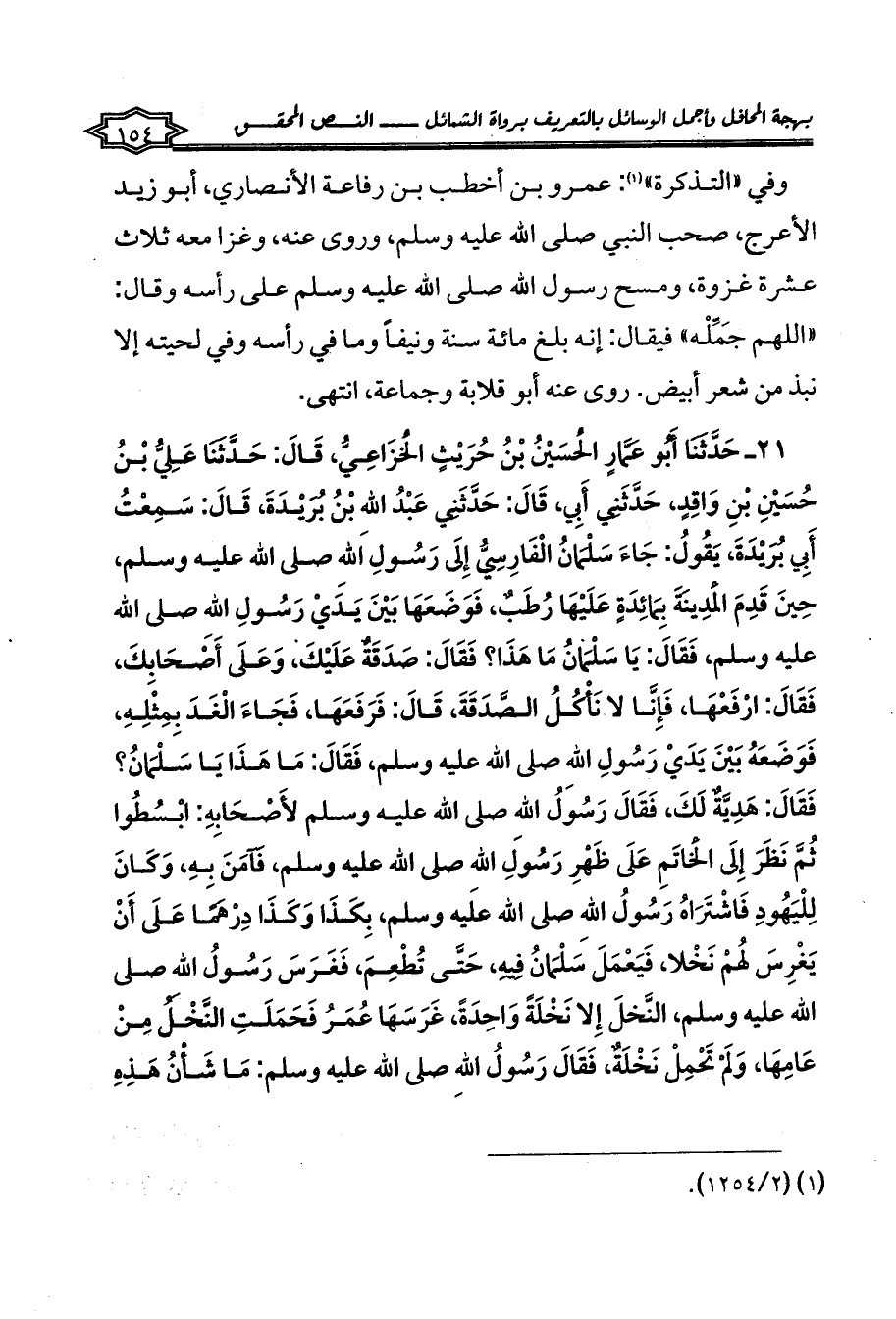 21 - حَدَّثَنَا أَبُو عَمَّارٍ الْحُسَيْنُ بْنُ حُرَيْثٍ الْخُزَاعِيُّ، قَالَ: حَدَّثَنَا عَلِيُّ بْنُ حُسَيْنِ بْنِ وَاقِدٍ، حَدَّثَنِي أَبِي، قَالَ: حَدَّثَنِي عَبْدُ اللهِ بْنُ بُرَيْدَةَ، قَالَ: سَمِعْتُ أَبِي بُرَيْدَةَ، يَقُولُ: جَاءَ سَلْمَانُ الْفَارِسِيُّ إِلَى رَسُولِ اللهِ صلى الله عليه وسلم، حِينَ قَدِمَ الْمَدِينَةَ بِمَائِدَةٍ عَلَيْهَا رُطَبٌ، فَوَضَعَهَا بَيْنَ يَدَيْ رَسُولِ اللهِ صلى الله عليه وسلم، فَقَالَ: يَا سَلْمَانُ مَا هَذَا؟ فَقَالَ: صَدَقَةٌ عَلَيْكَ، وَعَلَى أَصْحَابِكَ، فَقَالَ: ارْفَعْهَا، فَإِنَّا لا نَأْكُلُ الصَّدَقَةَ، قَالَ: فَرَفَعَهَا، فَجَاءَ الْغَدَ بِمِثْلِهِ، فَوَضَعَهُ بَيْنَ يَدَيْ رَسُولِ اللهِ صلى الله عليه وسلم، فَقَالَ: مَا هَذَا يَا سَلْمَانُ؟ فَقَالَ: هَدِيَّةٌ لَكَ، فَقَالَ رَسُولُ اللهِ صلى الله عليه وسلم لأَصْحَابِهِ: ابْسُطُوا ثُمَّ نَظَرَ إِلَى الْخَاتَمِ عَلَى ظَهْرِ رَسُولِ اللهِ صلى الله عليه وسلم، فَآمَنَ بِهِ، وَكَانَ لِلْيَهُودِ فَاشْتَرَاهُ رَسُولُ اللهِ صلى الله عليه وسلم، بِكَذَا وَكَذَا دِرْهَمًا عَلَى أَنْ يَغْرِسَ لَهُمْ نَخْلا، فَيَعْمَلَ سَلْمَانُ فِيهِ، حَتَّى تُطْعِمَ، فَغَرَسَ رَسُولُ اللهِ صلى الله عليه وسلم، النَّخلَ إِلا نَخْلَةً وَاحِدَةً، غَرَسَهَا عُمَرُ فَحَمَلَتِ النَّخْلُ مِنْ عَامِهَا، وَلَمْ تَحْمِلْ نَخْلَةٌ، فَقَالَ رَسُولُ اللهِ صلى الله عليه وسلم: مَا شَأْنُ هَذِهِ