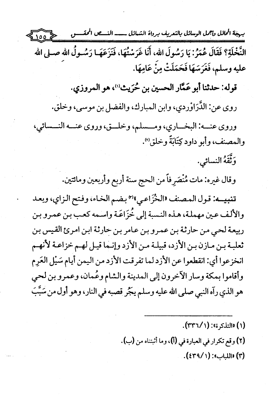 تنبيه: قول المصنف «الخُزَاعي» (¬3) بضم الخاء، وفتح الزاي، وبعد والألف عين مهملة، هذه النسبة إلى خُزَاعَة واسمه كعب بن عمرو بن ربيعة لحي من حارثة بن عمرو بن عامر بن حارثة ابن امرئ القيس بن ثعلبة بن مازن بن الأزد، قبيلة من الأزد وإنما قيل لهم خزاعة لأنهم انخزعوا أي: انقطعوا عن الأزد لما تفرقت الأزد من اليمن أيام سَيْل العَرِم وأقاموا بمكة وسار الآخرون إلى المدينة والشام وعُمان، وعمرو بن لحي هو الذي رآه النبي صلى الله عليه وسلم يَجُر قصبه في النار، وهو أول من سَبَّبَ