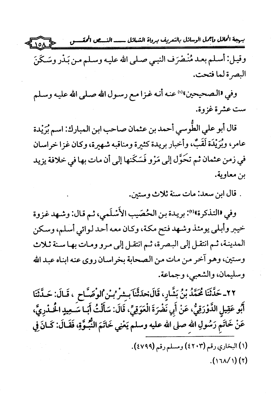 وفي «التذكرة» (¬2): بريدة بن الحُصَيب الأَسْلَمي، ثم قال: وشهد غزوة خيبر وأبلى يومئذ وشهد فتح مكة، وكان معه أحد لوائي أسلم، وسكن المدينة، ثم انتقل إلى البصرة، ثم انتقل إلى مرو ومات بها سنة ثلاث وستين، وهو آخر من مات من الصحابة بخراسان روى عنه ابناه عبد الله وسليمان، والشعبي، وجماعة.