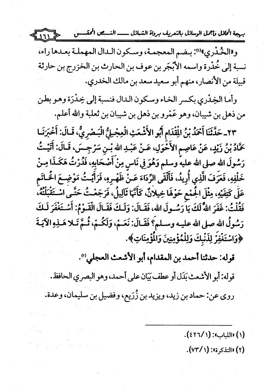 23 - حَدَّثَنَا أَحْمَدُ بْنُ الْمِقْدَامِ أَبُو الأَشْعَثِ الْعِجْلِيُّ الْبَصْرِيُّ، قَالَ: أَخْبَرَنَا حَمَّادُ بْنُ زَيْدٍ، عَنْ عَاصِمٍ الأَحْوَلِ، عَنْ عَبْدِ اللهِ بْنِ سَرْجِسَ، قَالَ: أَتَيْتُ رَسُولَ اللهِ صلى الله عليه وسلم وَهُوَ فِي نَاسٍ مِنْ أَصْحَابِهِ، فَدُرْتُ هَكَذَا مِنْ خَلْفِهِ، فَعَرَفَ الَّذِي أُرِيدُ، فَأَلْقَى الرِّدَاءَ عَنْ ظَهْرِهِ، فَرَأَيْتُ مَوْضِعَ الْخَاتَمِ عَلَى كَتِفَيْهِ، مِثْلَ الْجُمْعِ حَوْلَهَا خِيلانٌ، كَأَنَّهَا ثَآلِيلُ، فَرَجَعْتُ حَتَّى اسْتَقْبَلْتُهُ، فَقُلْتُ: غَفَرَ اللَّهُ لَكَ يَا رَسُولَ اللهِ، فَقَالَ: وَلَكَ فَقَالَ الْقَوْمُ: أَسْتَغْفَرَ لَكَ رَسُولُ اللهِ صلى الله عليه وسلم؟ فَقَالَ: نَعَمْ، وَلَكُمْ، ثُمَّ تَلا هَذِهِ الآيَةَ {وَاسْتَغْفِرْ لِذَنْبِكَ وَلِلْمُؤْمِنِينَ وَالْمُؤْمِنَاتِ}.