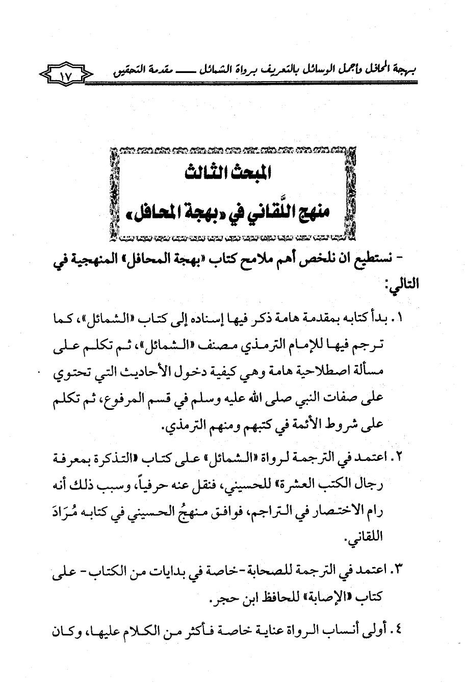 - نستطيع ان نلخص أهم ملامح كتاب «بهجة المحافل» المنهجية في التالي: