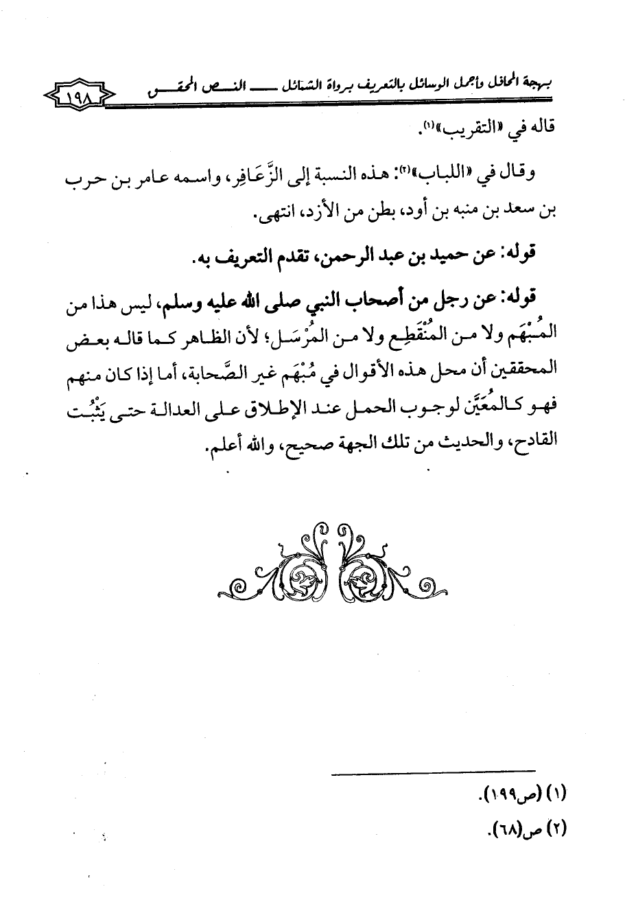 قوله: عن رجل من أصحاب النبي صلى الله عليه وسلم، ليس هذا من المُبْهَم ولا من المُنْقَطِع ولا من المُرْسَل؛ لأن الظاهر كما قاله بعض المحققين أن محل هذه الأقوال في مُبْهَم غير الصَّحابة، أما إذا كان منهم فهو كالمُعَيَّن لوجوب الحمل عند الإطلاق على العدالة حتى يَثْبُت القادح، والحديث من تلك الجهة صحيح، والله أعلم.