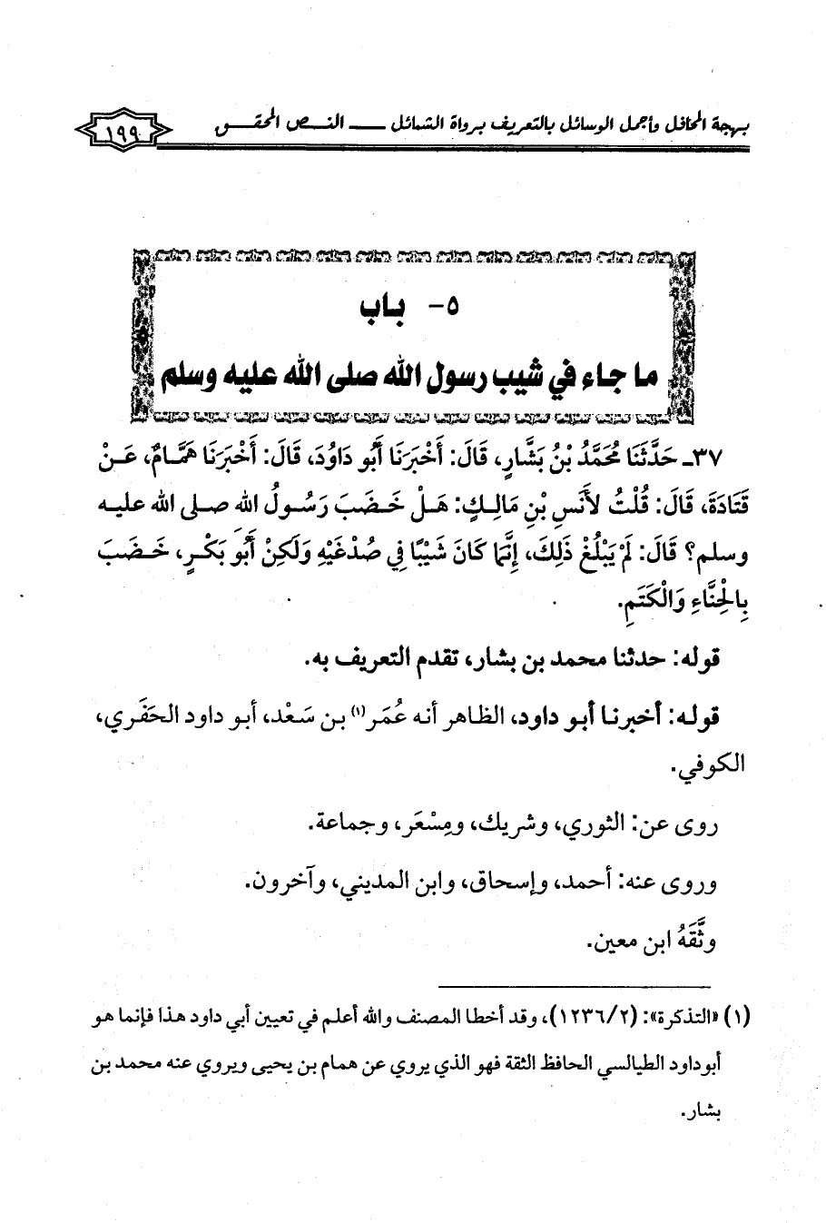 37 - حَدَّثَنَا مُحَمَّدُ بْنُ بَشَّارٍ، قَالَ: أَخْبَرَنَا أَبُو دَاوُدَ، قَالَ: أَخْبَرَنَا هَمَّامٌ، عَنْ قَتَادَةَ، قَالَ: قُلْتُ لأَنَسِ بْنِ مَالِكٍ: هَلْ خَضَبَ رَسُولُ اللهِ صلى الله عليه وسلم؟ قَالَ: لَمْ يَبْلُغْ ذَلِكَ، إِنَّمَا كَانَ شَيْبًا فِي صُدْغَيْهِ وَلَكِنْ أَبُو بَكْرٍ، خَضَبَ بِالْحِنَّاءِ وَالْكَتَمِ.