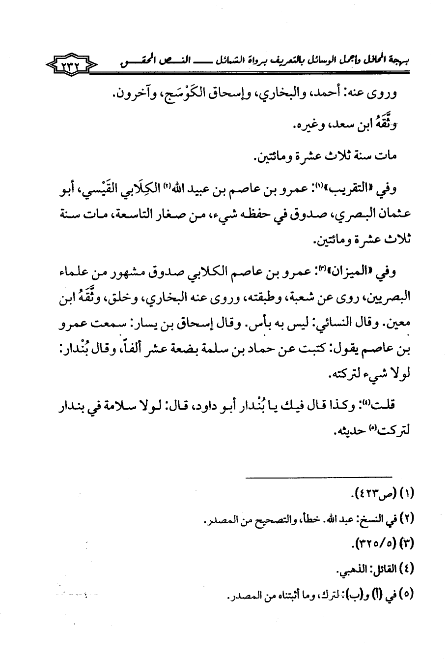 وفي «الميزان» (¬3): عمرو بن عاصم الكلابي صدوق مشهور من علماء البصريين، روى عن شعبة، وطبقته، وروى عنه البخاري، وخلق، وثَّقَهُ ابن معين. وقال النسائي: ليس به بأس. وقال إسحاق بن يسار: سمعت عمرو بن عاصم يقول: كتبت عن حماد بن سلمة بضعة عشر ألفاً، وقال بُنْدار: لولا شيء لتركته.