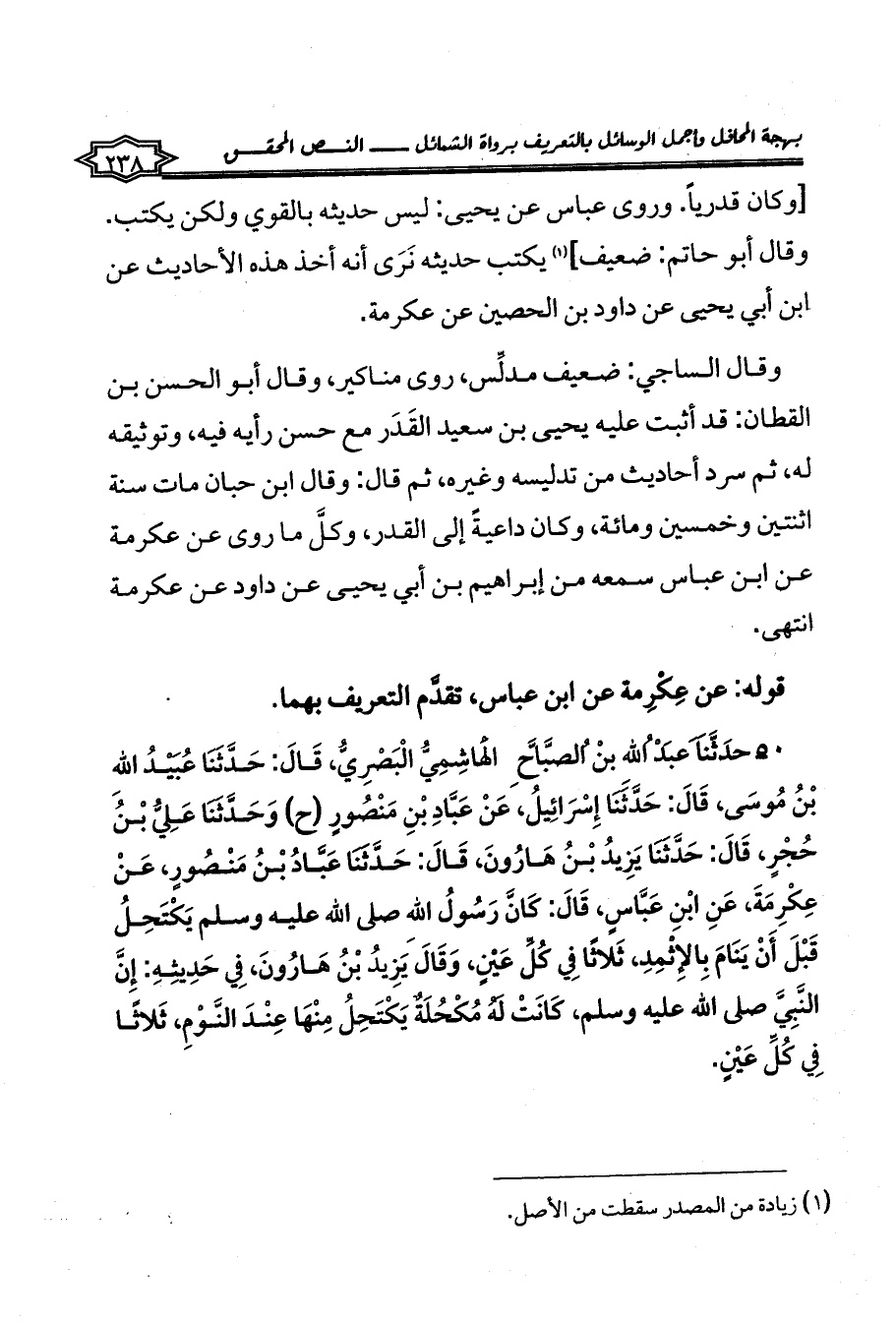 50 - حَدَّثَنَا عَبْدُ اللهِ بْنُ الصَّبَّاحِ الْهَاشِمِيُّ الْبَصْرِيُّ، قَالَ: حَدَّثَنَا عُبَيْدُ اللهِ بْنُ مُوسَى، قَالَ: حَدَّثَنَا إِسْرَائِيلُ، عَنْ عَبَّادِ بْنِ مَنْصُورٍ (ح) وَحَدَّثَنَا عَلِيُّ بْنُ حُجْرٍ، قَالَ: حَدَّثَنَا يَزِيدُ بْنُ هَارُونَ، قَالَ: حَدَّثَنَا عَبَّادُ بْنُ مَنْصُورٍ، عَنْ عِكْرِمَةَ، عَنِ ابْنِ عَبَّاسٍ، قَالَ: كَانَّ رَسُولُ اللهِ صلى الله عليه وسلم يَكْتَحِلُ قَبْلَ أَنْ يَنَامَ بِالإِثْمِدِ، ثَلاثًا فِي كُلِّ عَيْنٍ، وَقَالَ يَزِيدُ بْنُ هَارُونَ، فِي حَدِيثِهِ: إِنَّ النَّبِيَّ صلى الله عليه وسلم، كَانَتْ لَهُ مُكْحُلَةٌ يَكْتَحِلُ مِنْهَا عِنْدَ النَّوْمِ، ثَلاثًا فِي كُلِّ عَيْنٍ.