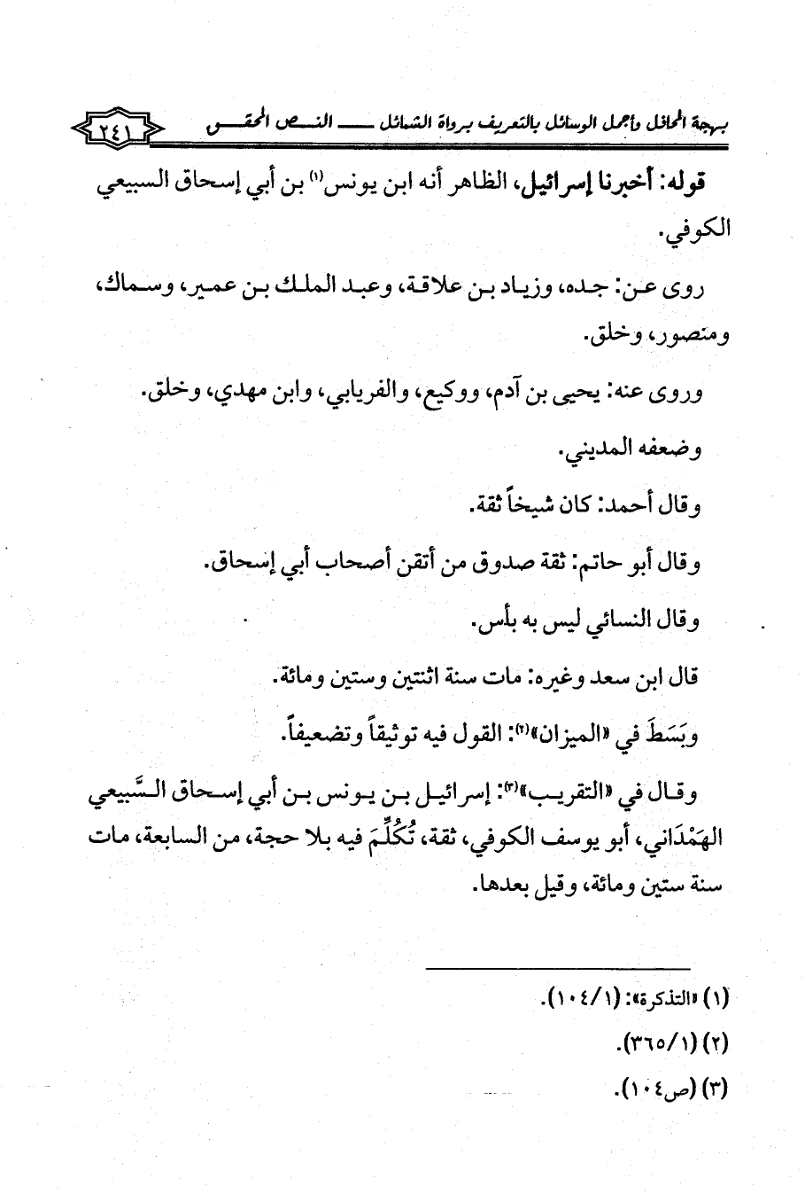وقال في «التقريب» (¬3): إسرائيل بن يونس بن أبي إسحاق السَّبيعي الهَمْدَاني، أبو يوسف الكوفي، ثقة، تُكُلِّمَ فيه بلا حجة، من السابعة، مات سنة ستين ومائة، وقيل بعدها.