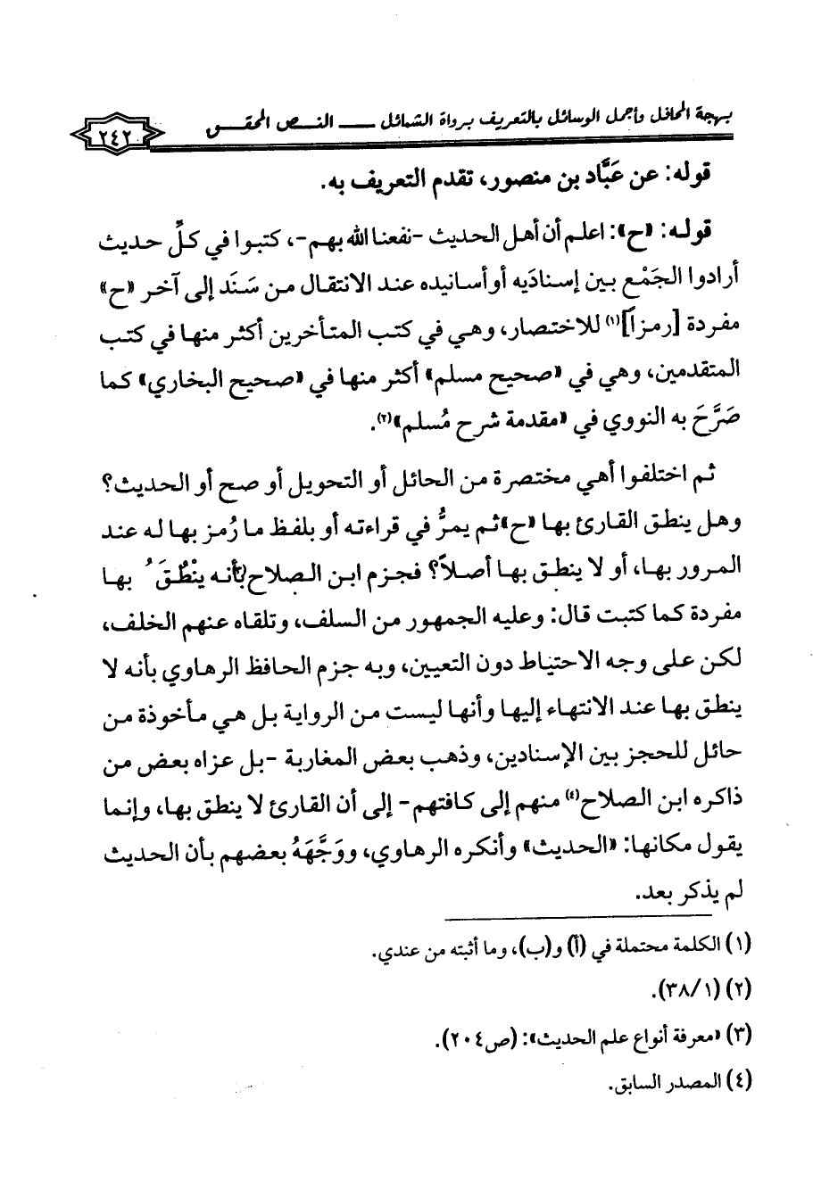 ثم اختلفوا أهي مختصرة من الحائل أو التحويل أو صح أو الحديث؟ وهل ينطق القارئ بها «ح» ثم يمرُّ في قراءته أو بلفظ ما رُمز بها له عند المرور بها، أو لا ينطق بها أصلاً؟ فجزم ابن الصلاح (¬3) بأنه يُنْطَقُ بها مفردة كما كتبت قال: وعليه الجمهور من السلف، وتلقاه عنهم الخلف، لكن على وجه الاحتياط دون التعيين، وبه جزم الحافظ الرهاوي بأنه لا ينطق بها عند الانتهاء إليها وأنها ليست من الرواية بل هي مأخوذة من حائل للحجز بين الإسنادين، وذهب بعض المغاربة -بل عزاه بعض من ذاكره ابن الصلاح (¬4) منهم إلى كافتهم- إلى أن القارئ لا ينطق بها، وإنما يقول مكانها: «الحديث» وأنكره الرهاوي، ووَجَّهَهُ بعضهم بأن الحديث لم يذكر بعد.