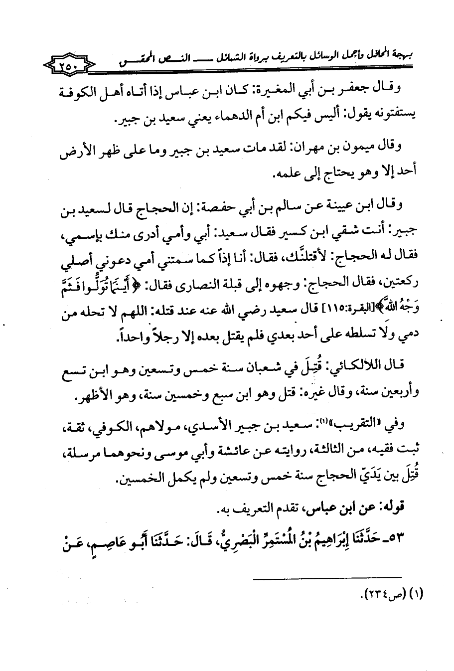 وفي «التقريب» (¬1): سعيد بن جبير الأسدي، مولاهم، الكوفي، ثقة، ثبت فقيه، من الثالثة، روايته عن عائشة وأبي موسى ونحوهما مرسلة، قُتِلَ بين يَدَيّ الحجاج سنة خمس وتسعين ولم يكمل الخمسين.