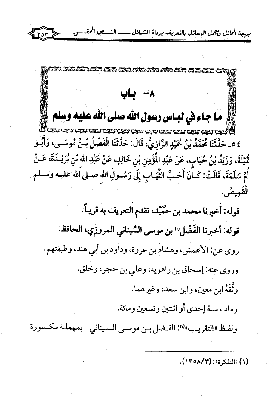 54 - حَدَّثَنَا مُحَمَّدُ بْنُ حُمَيْدٍ الرَّازِيُّ، قَالَ: حَدَّثَنَا الْفَضْلُ بْنُ مُوسَى، وَأَبُو تُمَيْلَةَ، وَزَيْدُ بْنُ حُبَابٍ، عَنْ عَبْدِ الْمُؤْمِنِ بْنِ خَالِدٍ، عَنْ عَبْدِ اللهِ بْنِ بُرَيْدَةَ، عَنْ أُمِّ سَلَمَةَ، قَالَتْ: كَانَ أَحَبَّ الثِّيَابِ إِلَى رَسُولِ اللهِ صلى الله عليه وسلم الْقَمِيصُ.