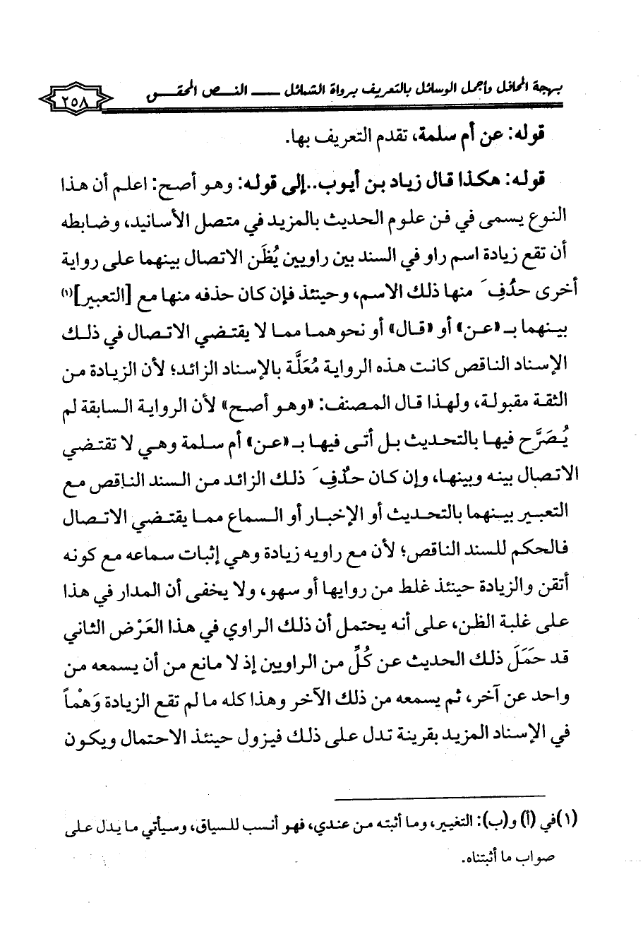 قوله: هكذا قال زياد بن أيوب .. إلى قوله: وهو أصح: اعلم أن هذا النوع يسمى في فن علوم الحديث بالمزيد في متصل الأسانيد، وضابطه أن تقع زيادة اسم راو في السند بين راويين يُظَن الاتصال بينهما على رواية أخرى حُذِفَ منها ذلك الاسم، وحينئذ فإن كان حذفه منها مع [التعبير] (¬1) بينهما بـ «عن» أو «قال» أو نحوهما مما لا يقتضي الاتصال في ذلك الإسناد الناقص كانت هذه الرواية مُعَلَّة بالإسناد الزائد؛ لأن الزيادة من الثقة مقبولة، ولهذا قال المصنف: «وهو أصح» لأن الرواية السابقة لم يُصَرَّح فيها بالتحديث بل أتى فيها بـ «عن» أم سلمة وهي لا تقتضي الاتصال بينه وبينها، وإن كان حُذِفَ ذلك الزائد من السند الناقص مع التعبير بينهما بالتحديث أو الإخبار أو السماع مما يقتضي الاتصال فالحكم للسند الناقص؛ لأن مع راويه زيادة وهي إثبات سماعه مع كونه أتقن والزيادة حينئذ غلط من روايها أو سهو، ولا يخفى أن المدار في هذا على غلبة الظن، على أنه يحتمل أن ذلك الراوي في هذا العَرْض الثاني قد حَمَلَ ذلك الحديث عن كُلِّ من الراويين إذ لا مانع من أن يسمعه من واحد عن آخر، ثم يسمعه من ذلك الآخر وهذا كله ما لم تقع الزيادة وَهْماً في الإسناد المزيد بقرينة تدل على ذلك فيزول حينئذ الاحتمال ويكون