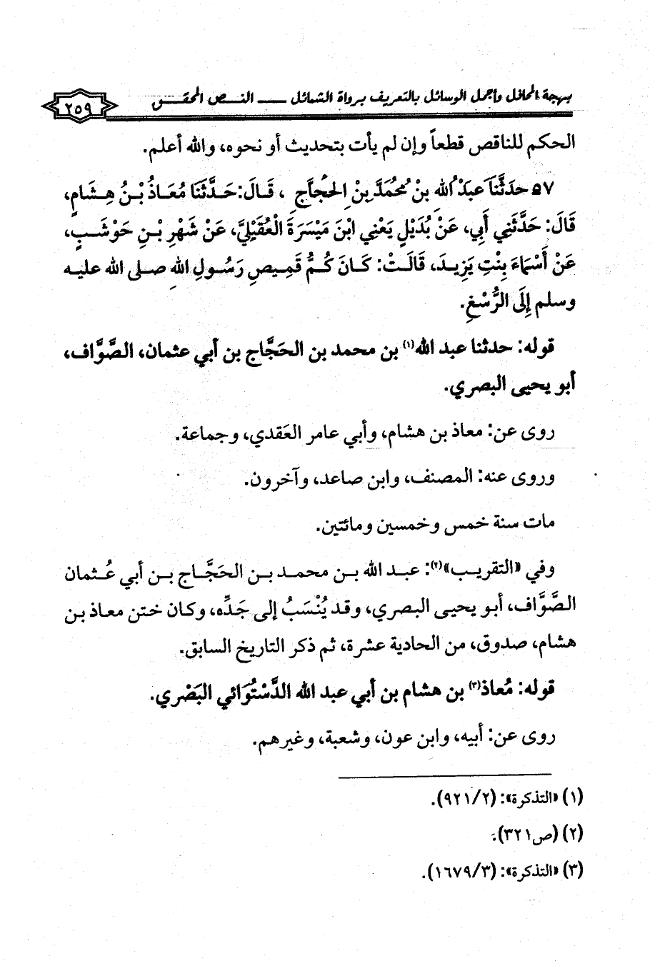 57 - حَدَّثَنَا عَبْدُ اللهِ بْنُ مُحَمَّدِ بْنِ الْحَجَّاجِ، قَالَ: حَدَّثَنَا مُعَاذُ بْنُ هِشَامٍ، قَالَ: حَدَّثَنِي أَبِي، عَنْ بُدَيْلٍ يَعْنِي ابْنَ مَيْسَرَةَ الْعُقَيْلِيَّ، عَنْ شَهْرِ بْنِ حَوْشَبٍ، عَنْ أَسْمَاءَ بِنْتِ يَزِيدَ، قَالَتْ: كَانَ كُمُّ قَمِيصِ رَسُولِ اللهِ صلى الله عليه وسلم إِلَى الرُّسْغِ.