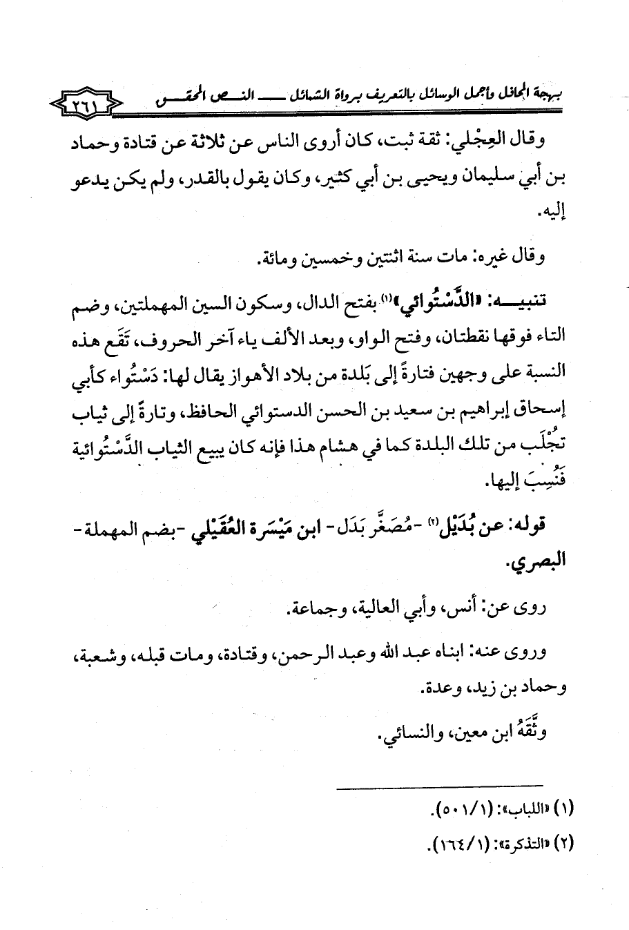 تنبيه: «الدَّسْتُوائي» (¬1) بفتح الدال، وسكون السين المهملتين، وضم التاء فوقها نقطتان، وفتح الواو، وبعد الألف ياء آخر الحروف، تَقَع هذه النسبة على وجهين فتارةً إلى بَلدة من بلاد الأهواز يقال لها: دَسْتُواء كأبي إسحاق إبراهيم بن سعيد بن الحسن الدستوائي الحافظ، وتارةً إلى ثياب تُجْلَب من تلك البلدة كما في هشام هذا فإنه كان يبيع الثياب الدَّسْتُوائية فَنُسِبَ إليها.