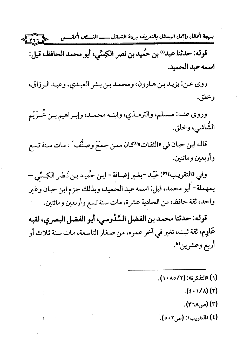 قوله: حدثنا محمد بن الفضل السَّدُوسي، أبو الفضل البصري، لقبه عَارِم، ثقة ثبت، تغير في آخر عمره، من صغار التاسعة، مات سنة ثلاث أو أربع وعشرين (¬4).