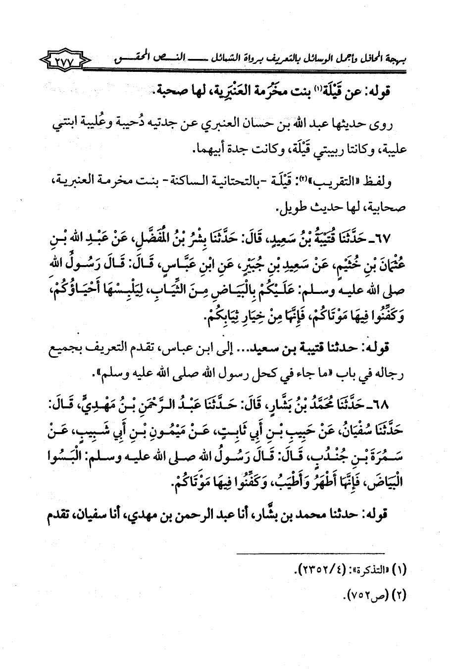 67 - حَدَّثَنَا قُتَيْبَةُ بْنُ سَعِيدٍ، قَالَ: حَدَّثَنَا بِشْرُ بْنُ الْمُفَضَّلِ، عَنْ عَبْدِ اللهِ بْنِ عُثْمَانَ بْنِ خُثَيْمٍ، عَنْ سَعِيدِ بْنِ جُبَيْرٍ، عَنِ ابْنِ عَبَّاسٍ، قَالَ: قَالَ رَسُولُ اللهِ صلى الله عليه وسلم: عَلَيْكُمْ بِالْبَيَاضِ مِنَ الثِّيَابِ، لِيَلْبِسْهَا أَحْيَاؤُكُمْ، وَكَفِّنُوا فِيهَا مَوْتَاكُمْ، فَإِنَّهَا مِنْ خِيَارِ ثِيَابِكُمْ.