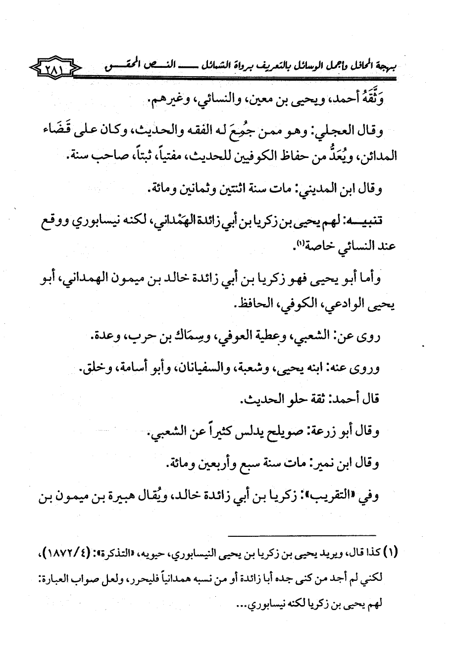 (¬1) كذا قال، ويريد يحيى بن زكريا بن يحيى النيسابوري، حيويه، «التذكرة»: (4/ 1872)، لكني لم أجد من كنى جده أبا زائدة أو من نسبه همدانياً فليحرر، ولعل صواب العبارة: لهم يحيى بن زكريا لكنه نيسابوري ...